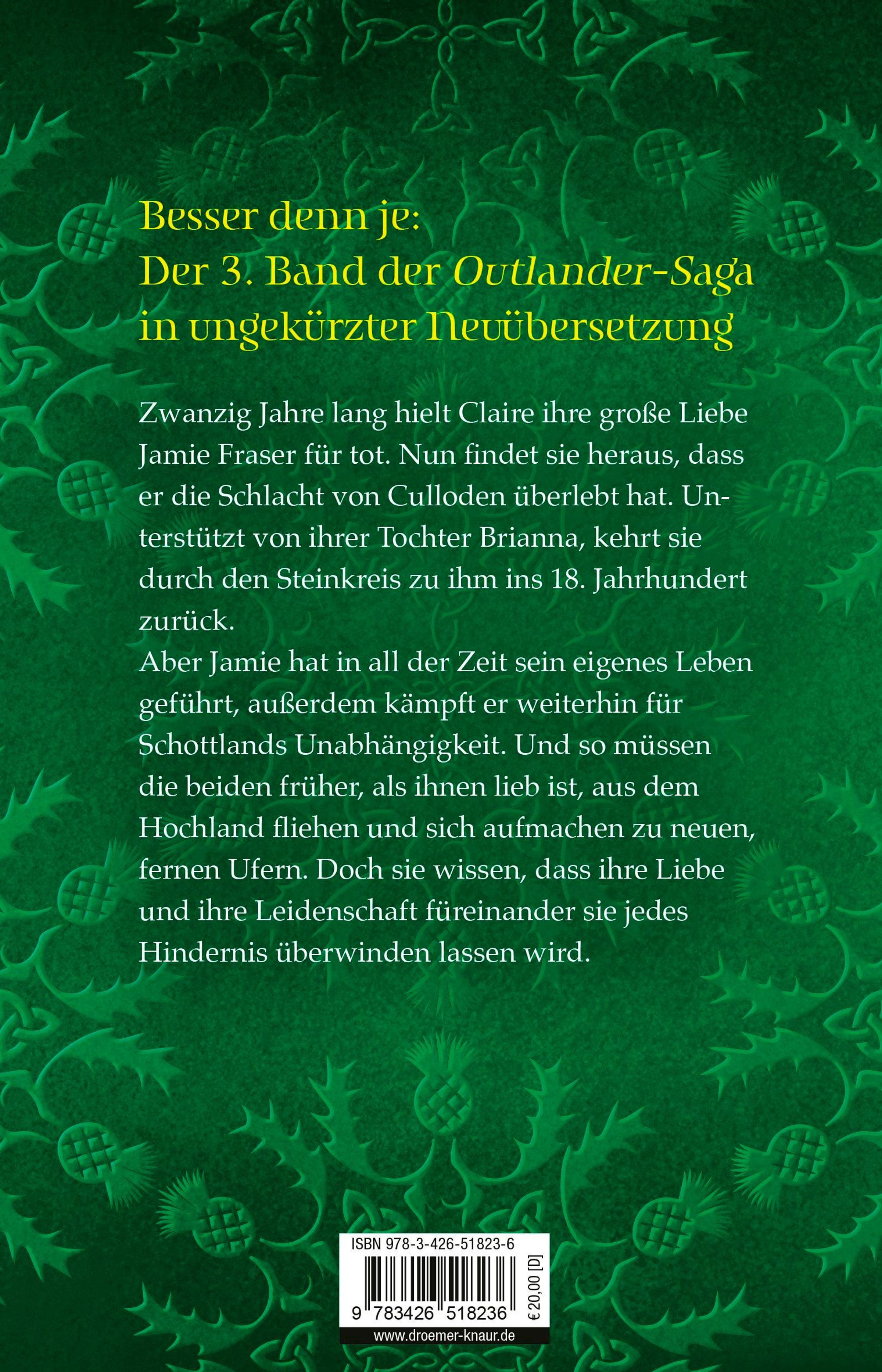 20 Jahre lang hielt Claire ihre große Liebe Jamie Fraser für tot. Nun findet sie heraus, dass er die Schlacht von Culloden wider Erwarten überlebt hat. Unterstützt von ihrer Tochter Brianna kehrt sie durch den Steinkreis zu ihm zurück und findet ihn im 18. Jahrhundert lebend wieder.