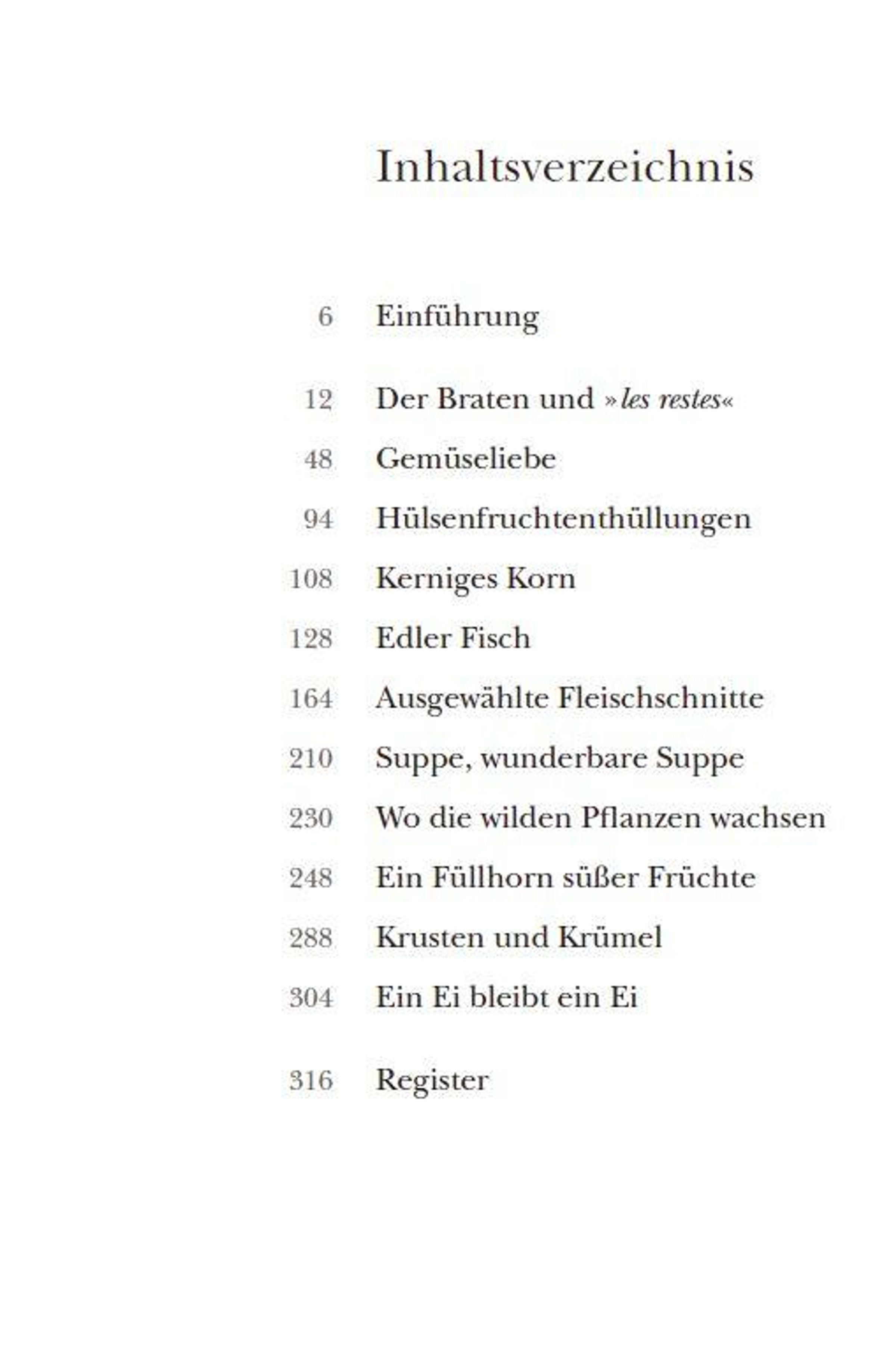 11 Kapitel mit unwiderstehlichen Rezepten, unter anderem zu Hülsenfrüchten, Fisch, Fleisch, Wildkräutern und Obst