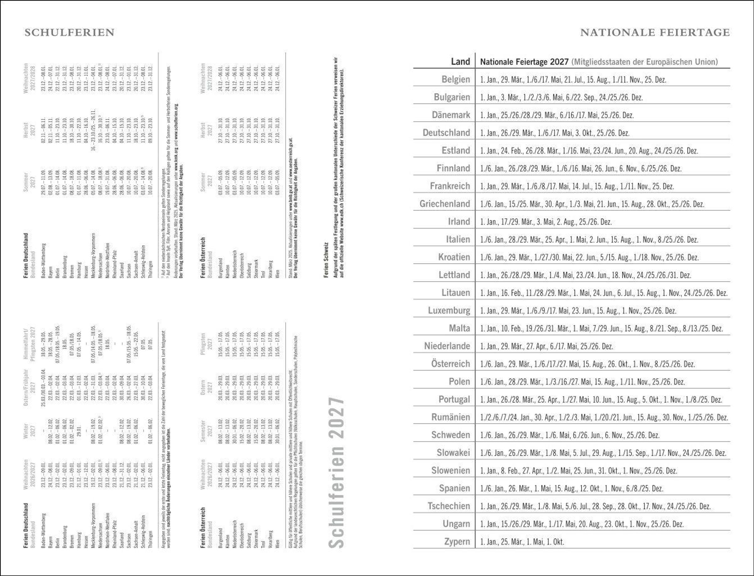 Mit zahlreichen Extras wie Jahresübersicht, Vorausschau auf 2028, Schulferien, Adressbuch und To-do-Listen
