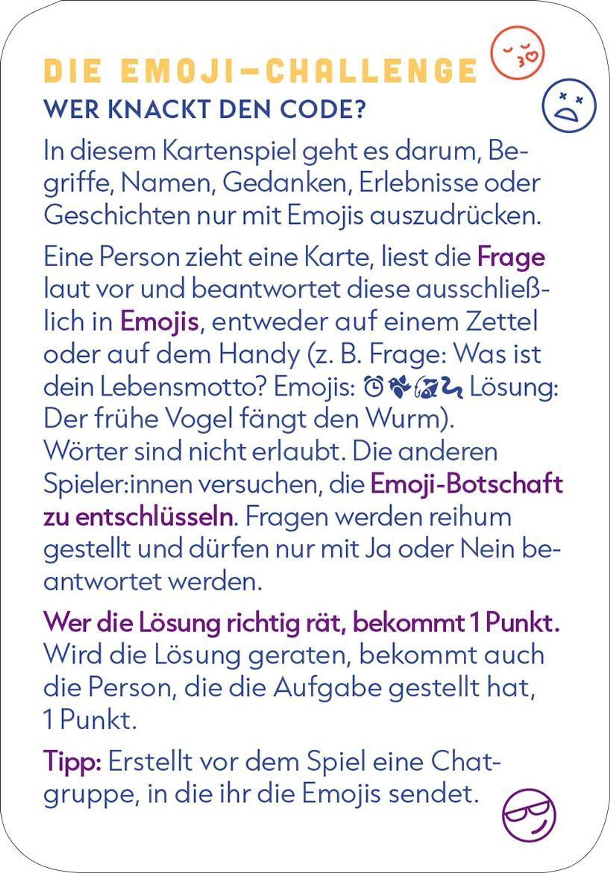 - **Kommunikation mal anders:**Beantworte Fragen nur mit Emojis und lass andere deine Botschaft entschlüsseln