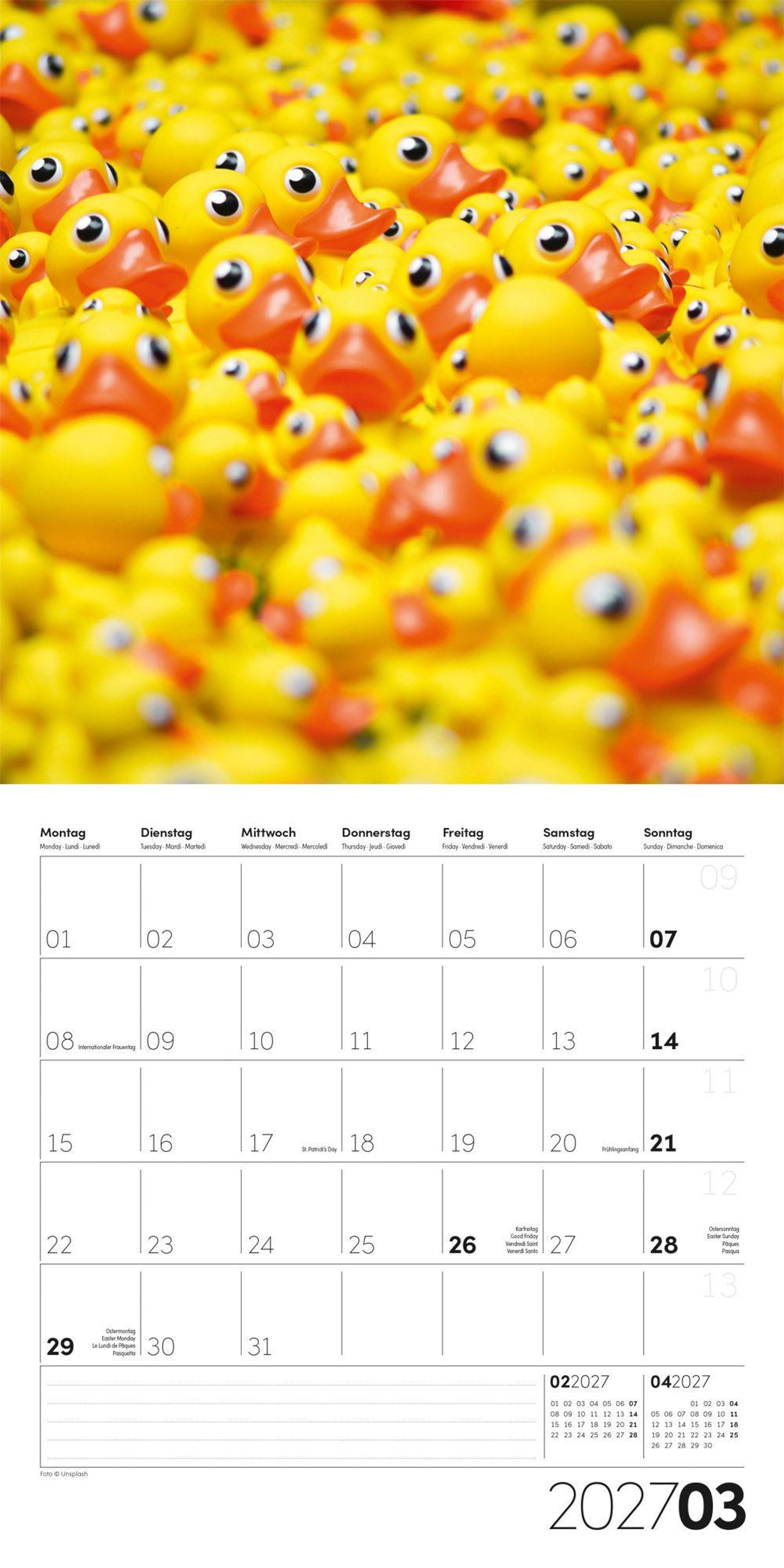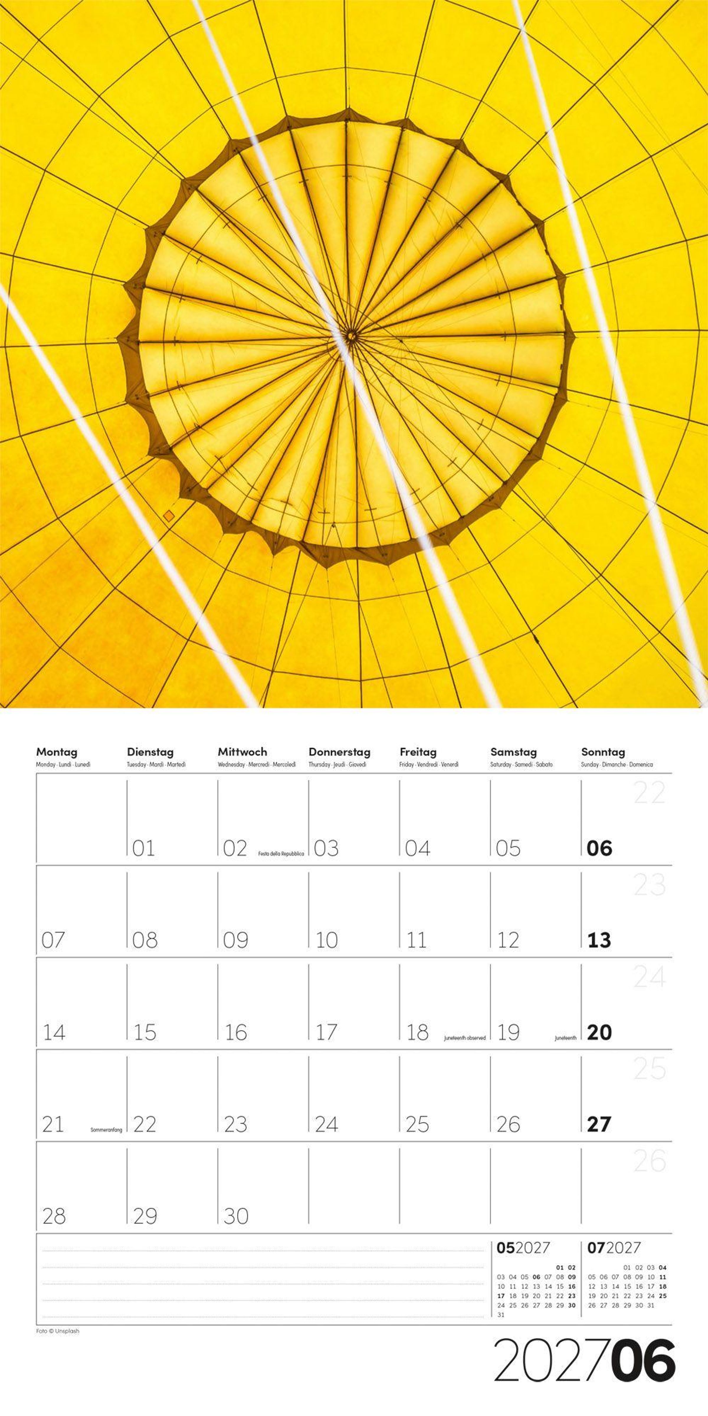 Bilder: Heißluftballon von innen, gelbe Enten, gelbe Tür, Sonnenblume., Kalender
