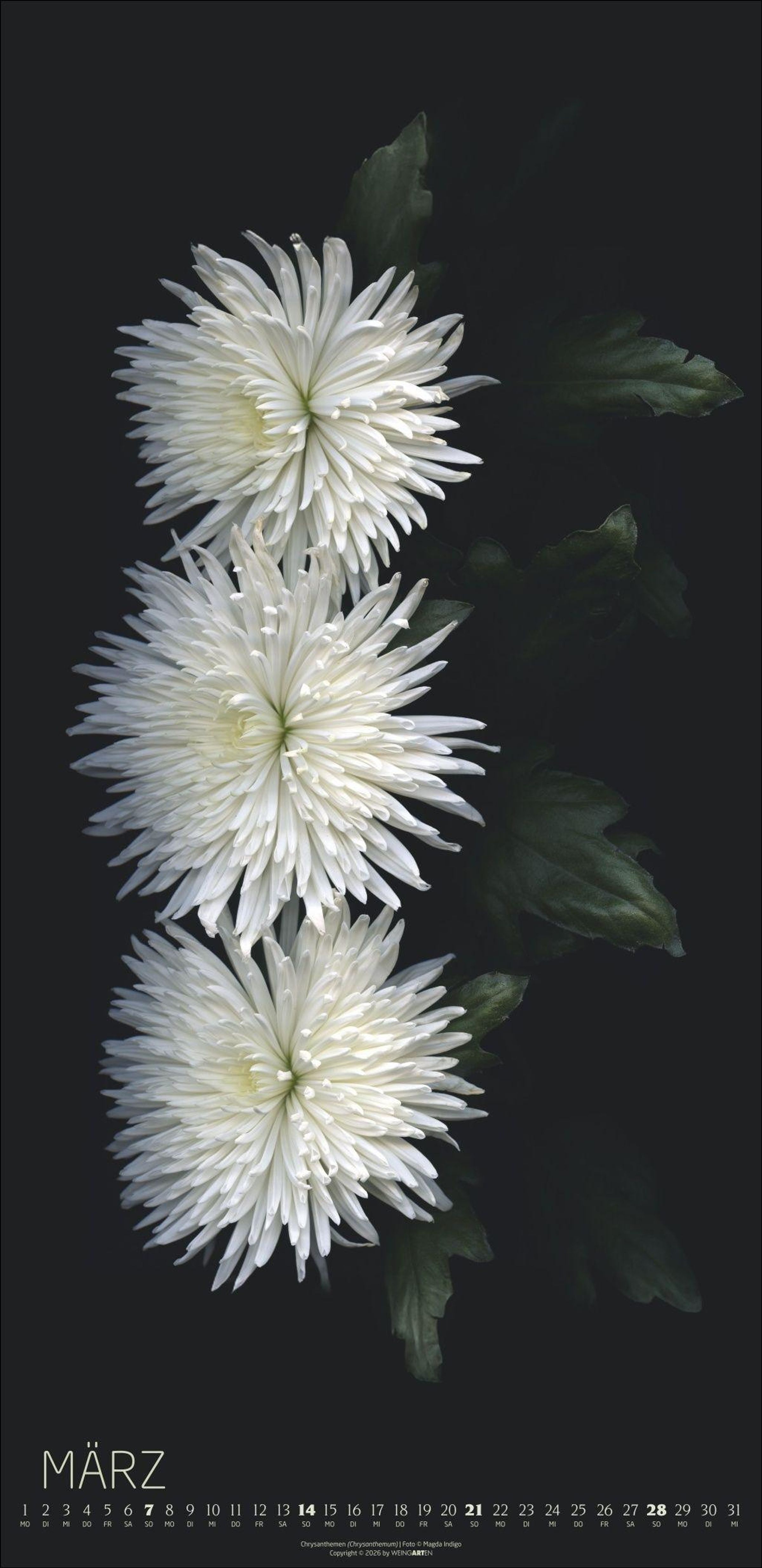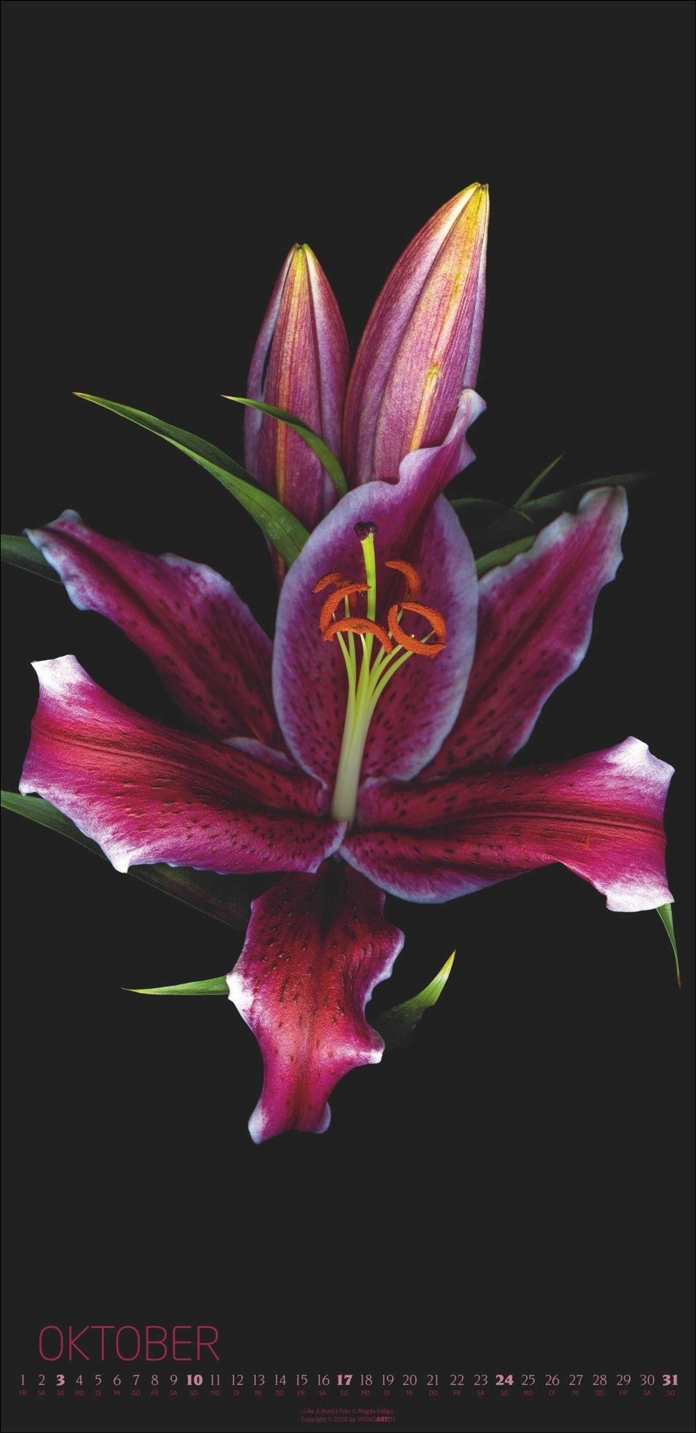 - Langer Wandkalender mit farbenprächtigen Blumen-Fotos. Dekorativer XL Kalender mit beeindruckenden Blüten auf schwarzem Hintergrund. 33 x 68 cm
