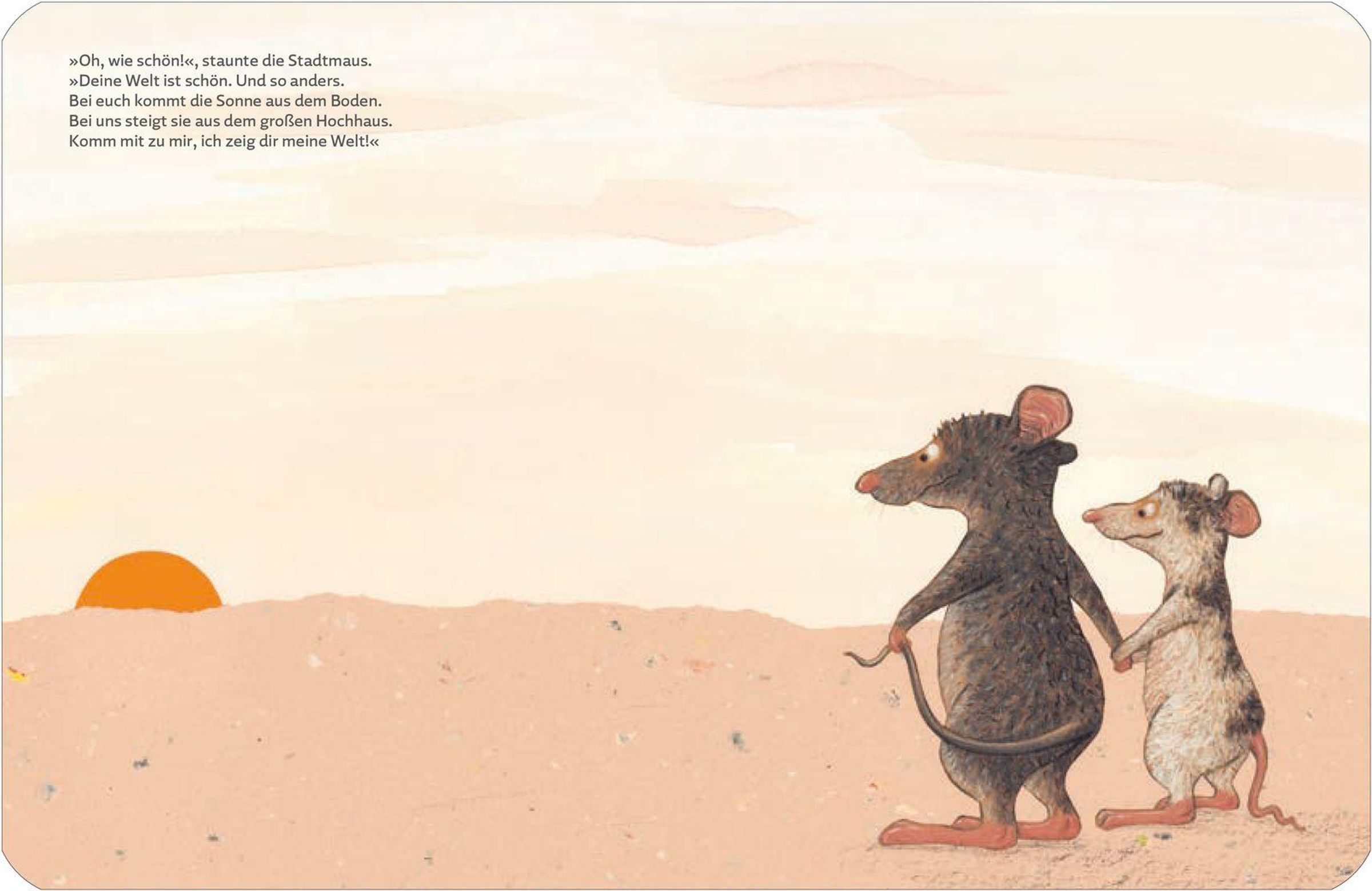 "Die Stadtmaus und die Landmaus" von Kathrin Schärer. Illustration: Zwei Mäuse halten sich an den Händen vor Sonnenuntergang., Buch