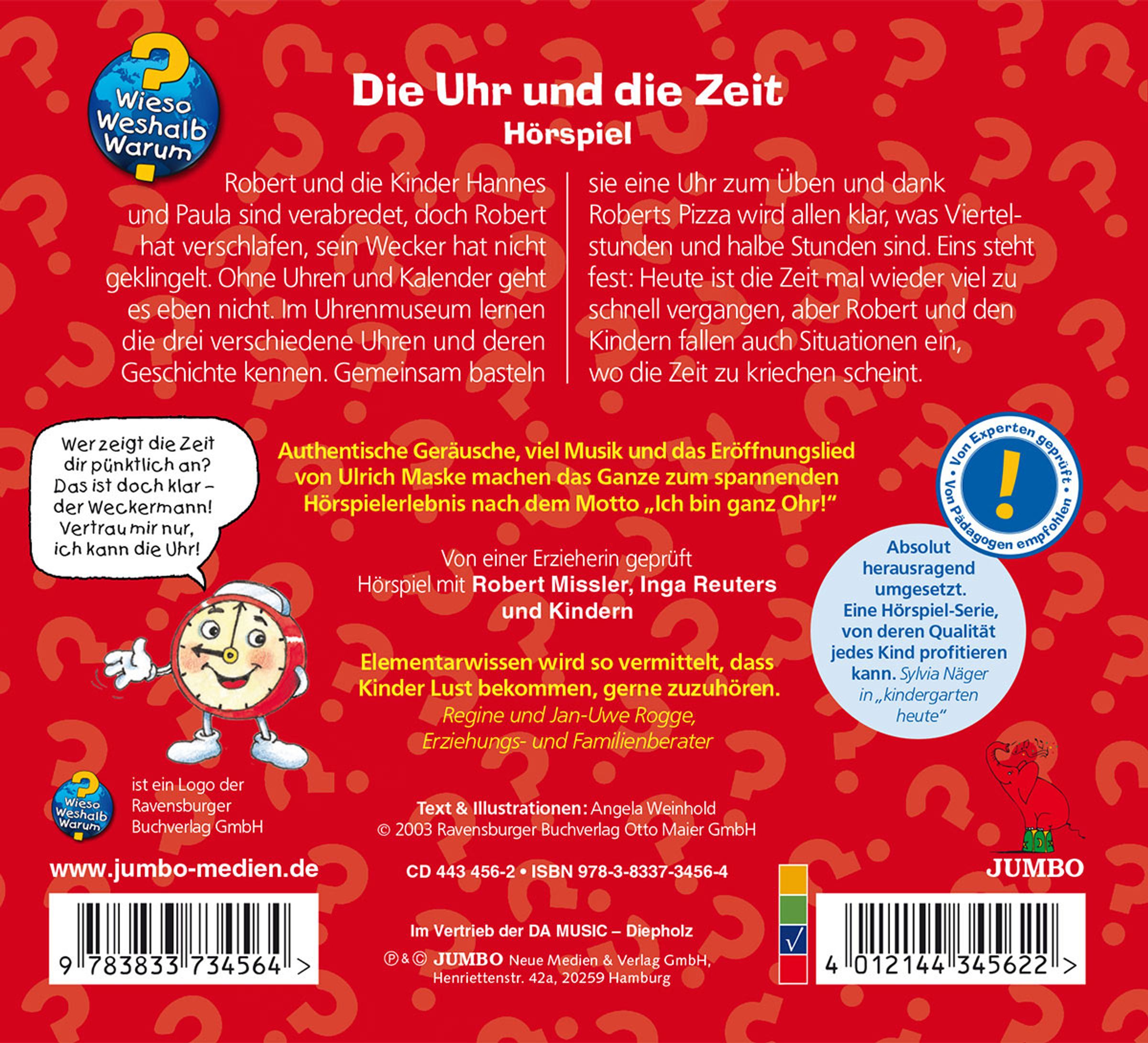 . Wieso dreht sich alles um die Zeit? . Warum gibt es Tag und Nacht? . Warum gibt es Sommer und Winter? . Was ist ein Monat? . Gab es schon immer Uhren? . Warum gibt es überall Uhren? . Wie liest man die Uhr? . Wo sind die halben und Viertelstunden? . Wer zeigt mir die Minuten? . Laufen Uhren auch nachts? . Was sind Digitaluhren? . Und was ist eine Sekunde? . Ist die Uhrzeit überall gleich auf der Welt? . Wer hat die genaueste Zeit? . Wie lange dauert was? . Wann hört es auf zu dauern?Disk 1 von 1 (CD)