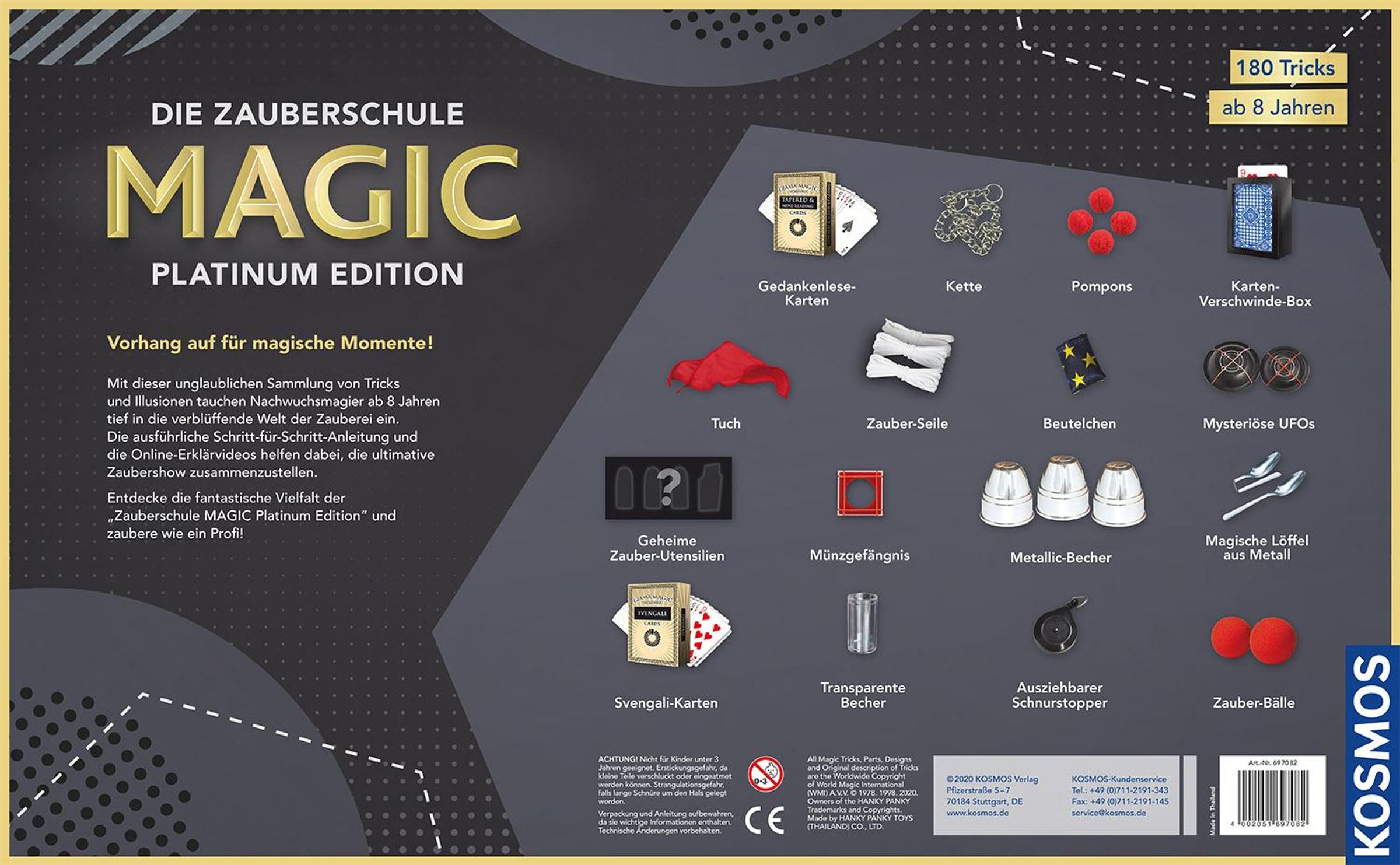Vorhang auf für große Zauberer! Mit dem Zauberkasten "Die Zauberschule MAGIC Platinum Edition" die zauberhafte Welt der Magie eintauchen! Angehende Zauberkünstler erlernen geniale Illusionen und Tricks mit magischem Equipment. Die ausführliche Anleitung führt Kinder ab 8 Jahren durch unzählige Übungen mit Zauberdaumen, Zauberlöffel, magischen Kartendecks, Zauberbechern, Seilen, Bällen, UFOS und Co. Dabei lernen jungen Zauberer Genauigkeit, trainieren ihr schauspielerisches Talent und schulen die Konzentration. Lust auf noch mehr Magie? Online-Tutorials auf der KOSMOS-Webseite zeigen ganz besonders anspruchsvolle Übungen. Diese Schule macht riesig Spaß und sorgt für magische Momente im Kinderzimmer. Abrakadabra!