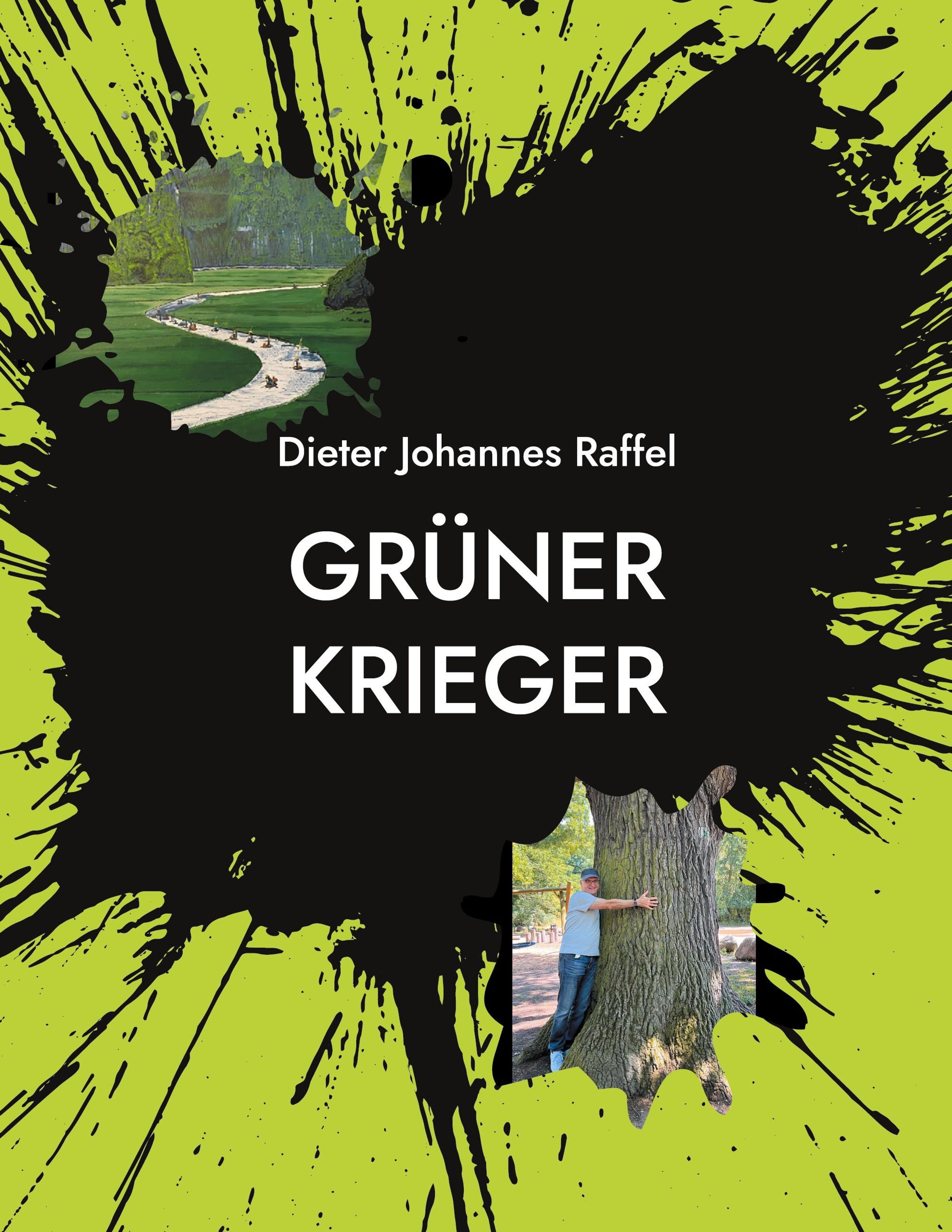 Grüner Hintergrund mit schwarzem Spritzer, Text: "Dieter Johannes Raffel - GRÜNER KRIEGER". Zwei Bildausschnitte: Weg und Mann umarmt Baum., Buch