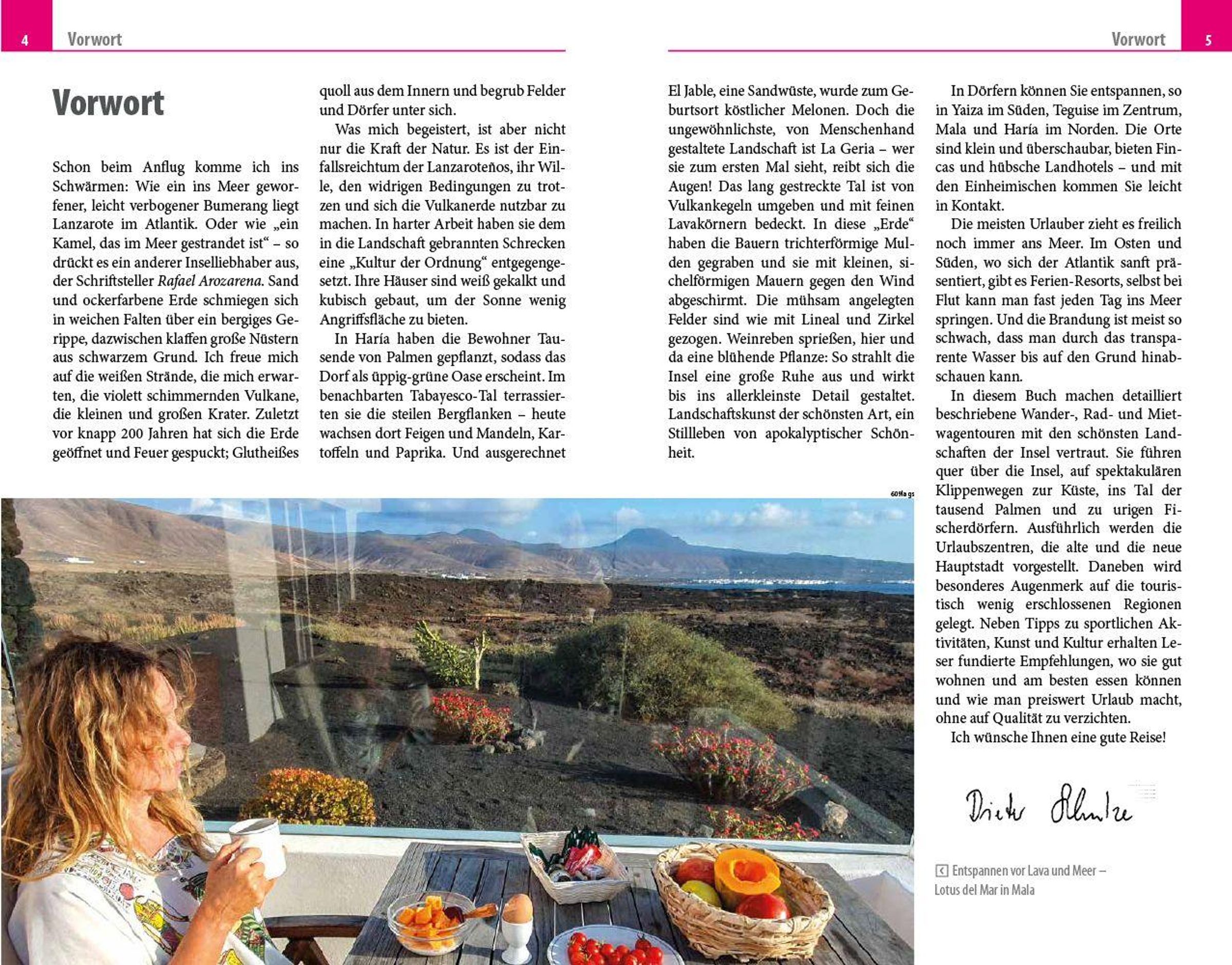 "Wie ein ins Meer geworfener Bumerang liegt Lanzarote im Atlantik. [...] Sand und ockerfarbene Erde schmiegen sich in weichen Falten über ein bergiges Gerippe, dazwischen klaffen große Nüstern auf schwarzem Grund." So beschreibt Autor Dieter Schulze die wohl faszinierendste der kanarischen Inseln. Gewaltige Kräfte aus dem Erdinneren haben eine einzigartige Vulkanlandschaft geschaffen, der die Insulaner über Jahrhunderte ihr besonderes Gepräge verliehen: Inmitten der schwarzen Wüsten und Lavafelder gedeihen üppige Oasen, die Wein, Mandeln und Feigen hervorbringen. Wie weiße Tupfer betten sich dazwischen die Dörfer mit ihren charakteristischen gekalkten Fincas und Windmühlen ein.