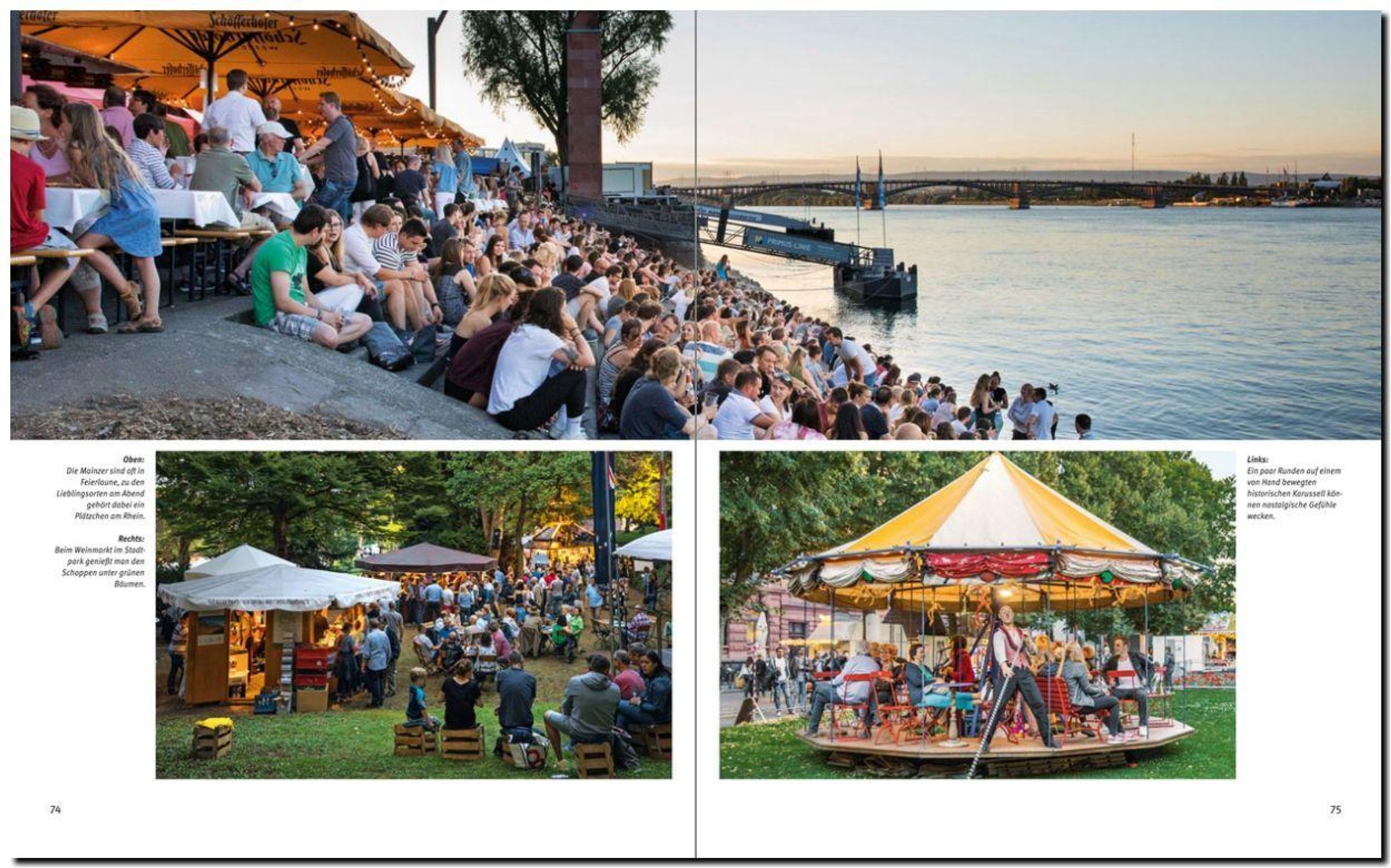 Heute genießt man in der Rheinmetropole das sommerliche Leben am Fluss, in der Fünften Jahreszeit verwandeln kostümierte Fastnachter Helau rufend, schunkelnd und tanzend die Straßen in ein einziges Tollhaus. Am Kirschgarten machen Fachwerkhäuser und ein Brunnen die Postkartenidylle fast perfekt, den Puls der Stadt spürt man an der "Lu" (Ludwigsstraße), der Flaniermeile, die schon Kaiser Napoleon als "Grand Rue Napoleon" zwischen Dom und Schillerplatz plante. In der Mainzer Neustadt locken viele Plätze, verkehrsberuhigte Straßen, Kneipen und Cafés.