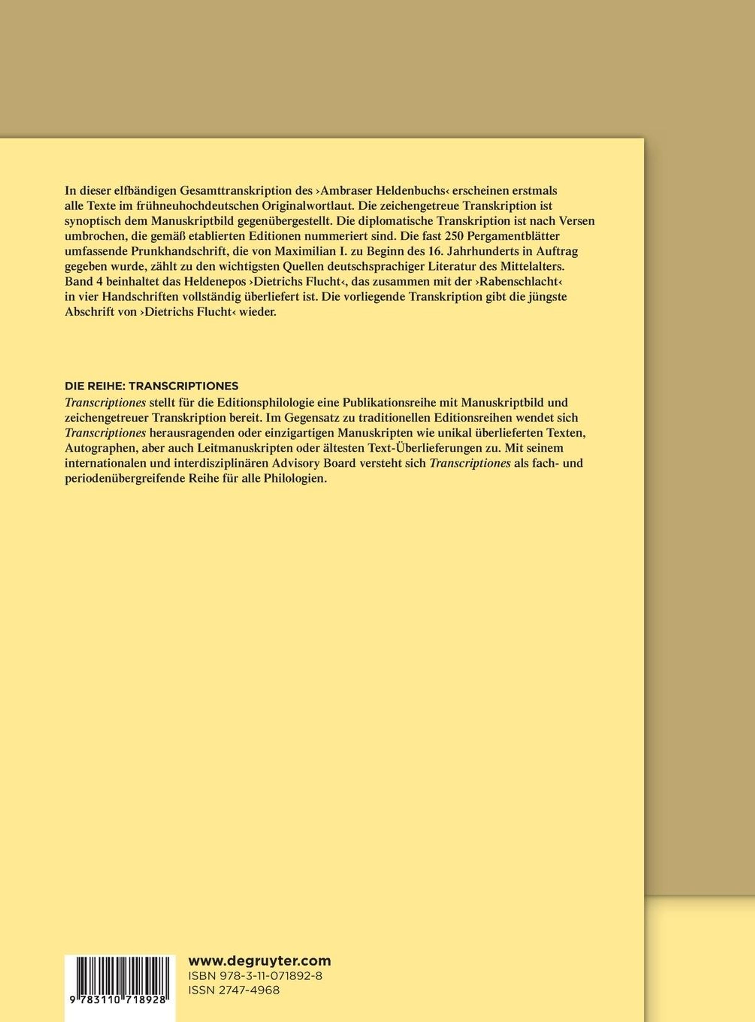 In this eleven-volume complete transcription of the 'Ambraser Heldenbuch,' all texts appear in the original Early High German for the first time. A transcription that is faithful to individual characters used by the scribe is synoptically juxtaposed with the manuscript image. A second, diplomatic transcription is arranged by verses and numbered according to established editions. The lavishly illustrated manuscript of almost 250 parchment folios, commissioned by Emperor Maximilian I at the beginning of the sixteenth century, is one of the most important sources of German narrative literature of the Middle Ages. Volume 4 contains the heroic epic 'Dietrichs Flucht,' which, together with the 'Rabenschlacht,' has survived as a complete text in three other manuscripts outside the 'Ambraser Heldenbuch.' The present transcription reproduces the youngest extant copy of 'Dietrichs Flucht.'