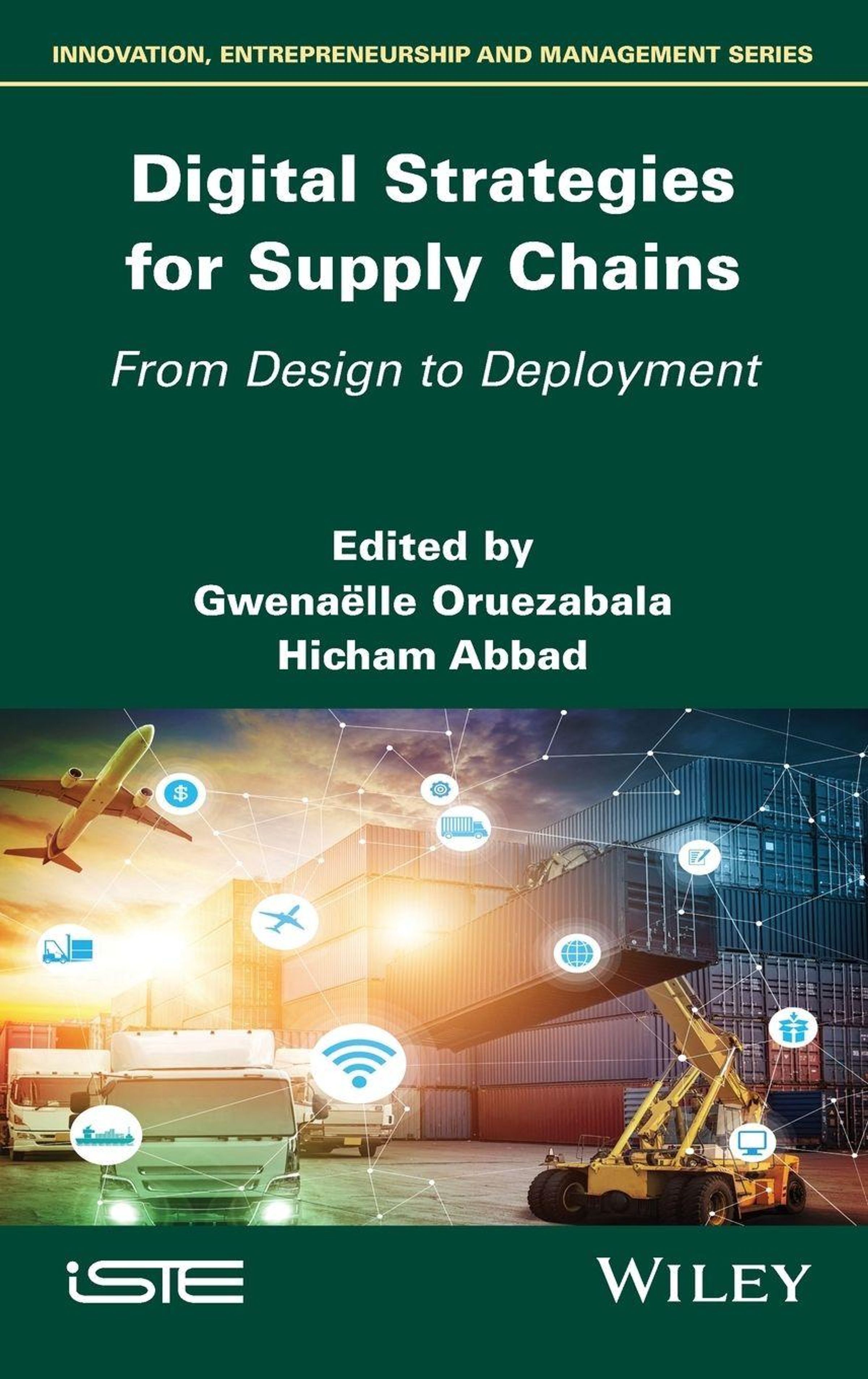 "Digital Strategies for Supply Chains: From Design to Deployment" ist ein Buchcover mit Logistikmotiv, Containern und Icons., Buch