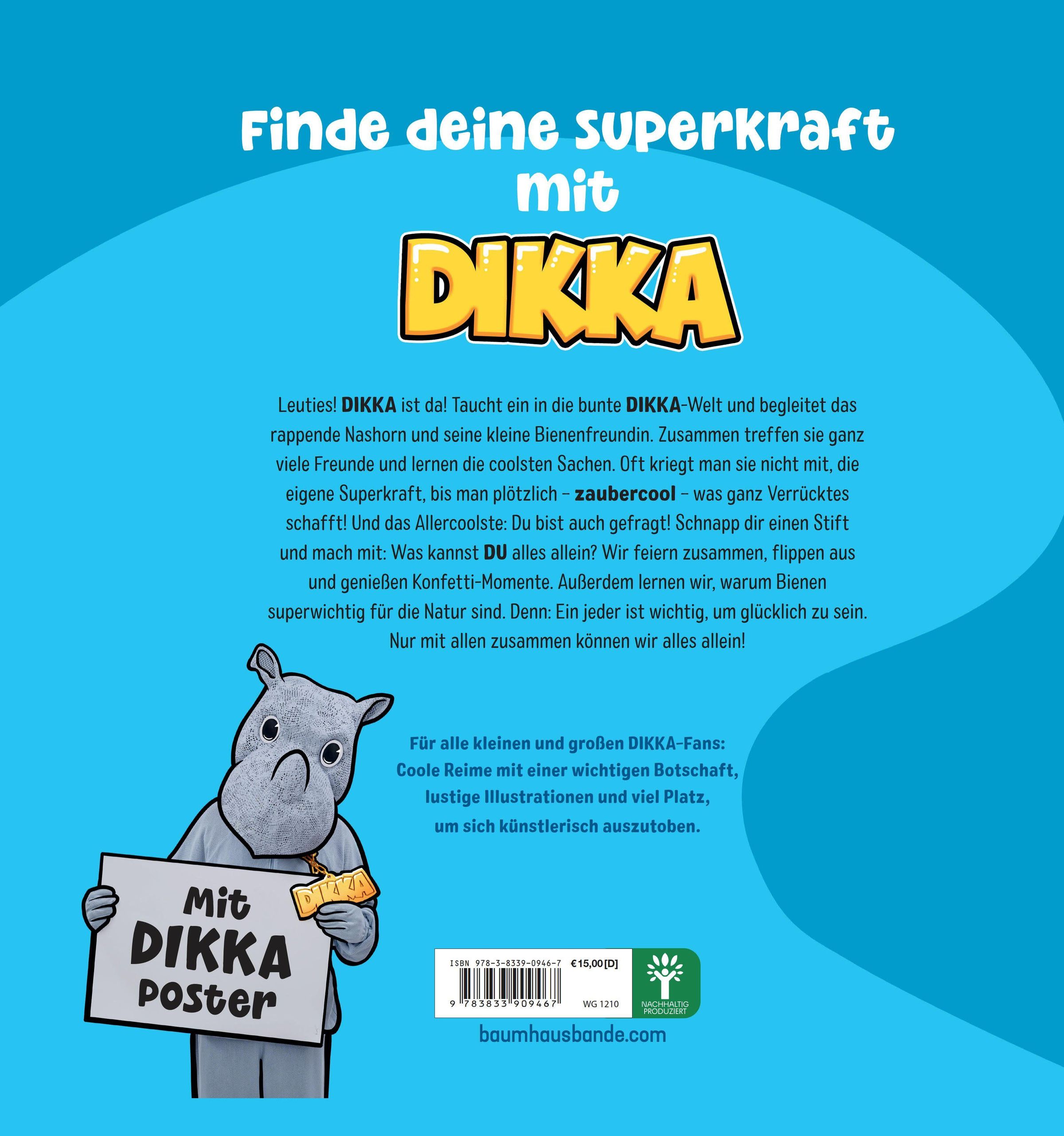 Das Nashorn DIKKA ist aktuell der erfolgreichste Musiker im Kinderbereich. Wenn seine Songs ertönen, gibt es bei Klein und Groß kein Halten mehr: Hier treffen freche Texte auf altbekannte Hip-Hop-Beats. DIKKA ist der coole große Freund, der die Kinder ermutigt, ihr Ding zu machen. Und nun gibt's das beliebte Nashorn nicht mehr nur auf die Ohren, sondern auch im Bilderbuch: Die kleine Biene ist schüchtern und verunsichert, bis DIKKA sie an die Hand nimmt. Zusammen mit seinen Freunden zeigt er ihr, was sie eigentlich schon alles kann: "Ich zieh gern 'ne Hose über 'nen Rock. Du sagst, kann ich nicht, haha, kann ich doch!" DIKKA macht Kindern Mut, die Welt auf ihre eigene Weise zu erobern.