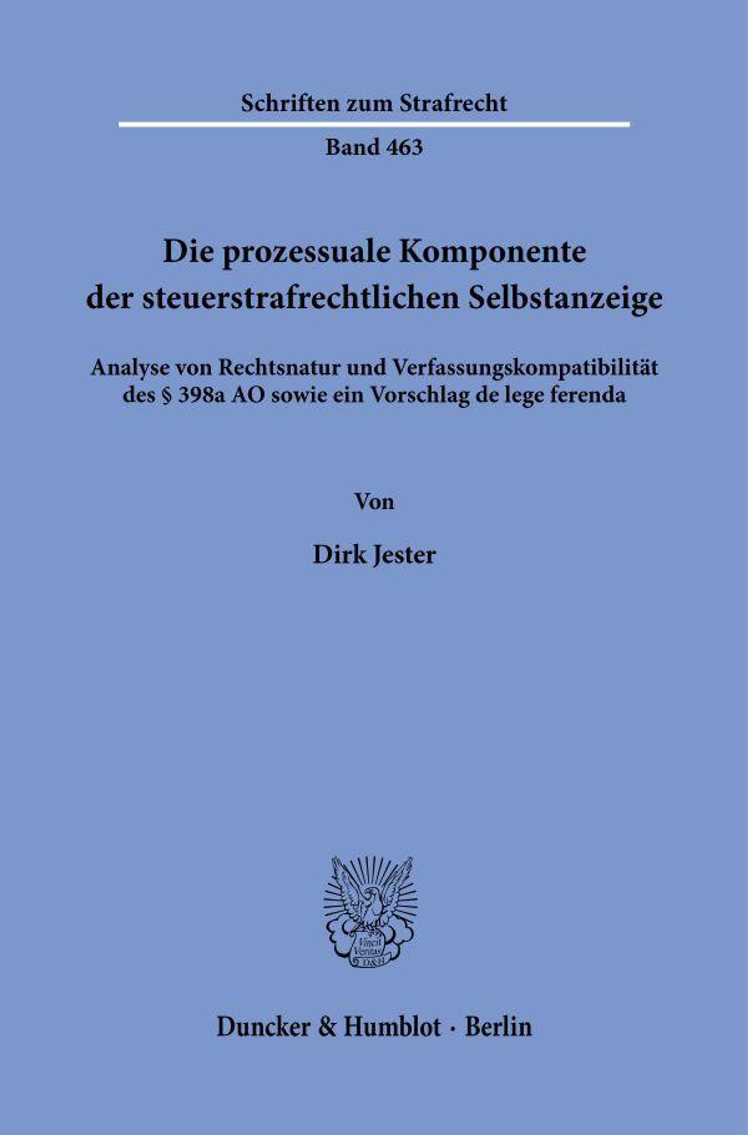 'The Procedural Dimension of the Voluntary Disclosure in Tax Criminal Law. An Analysis of the Legal Nature and Constitutional Compatibility of § 398a AO, Together with a Proposal De Lege Ferenda': The study examines the legal nature of the sanction in § 398a AO and classifies it as a genuine criminal penalty. Building on this, it offers a constitutional analysis showing that the provision fails to meet the requirements of culpability and judicial authorization and is therefore in need of reform. It also evaluates the norm from an EU-law perspective, focusing on the transnational ne bis in idem principle.