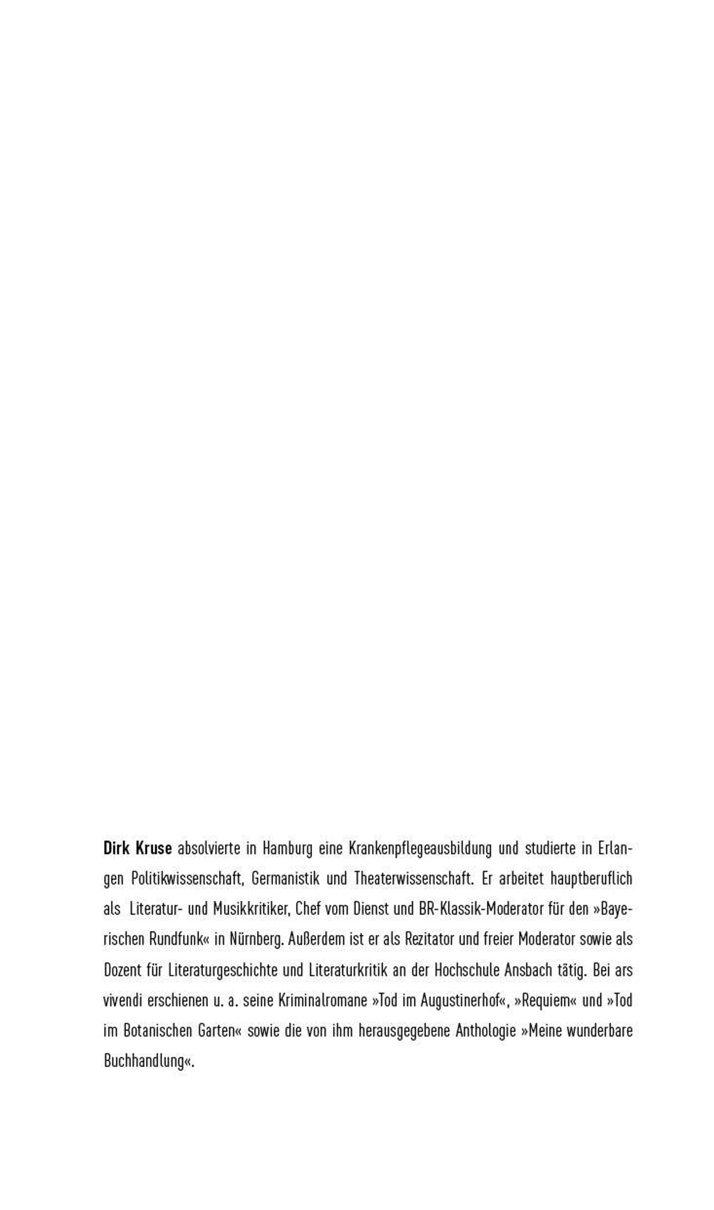 Dirk Kruse, geb. 1964 in Geesthacht, studierte nach einer Krankenpflegeausbildung in Hamburg in Erlangen Politikwissenschaft, Germanistik und Theaterwissenschaft. Seit 1995 ist er hauptberuflich für den Bayerischen Rundfunk als Literatur- und Theaterkritiker, Moderator und Nachrichtenreporter tätig. Dirk Kruse arbeitet zudem als freier Moderator sowie als Dozent für Sozialkunde, Ethik und Deutsch in Erlangen und Nürnberg.Anmerkungen: