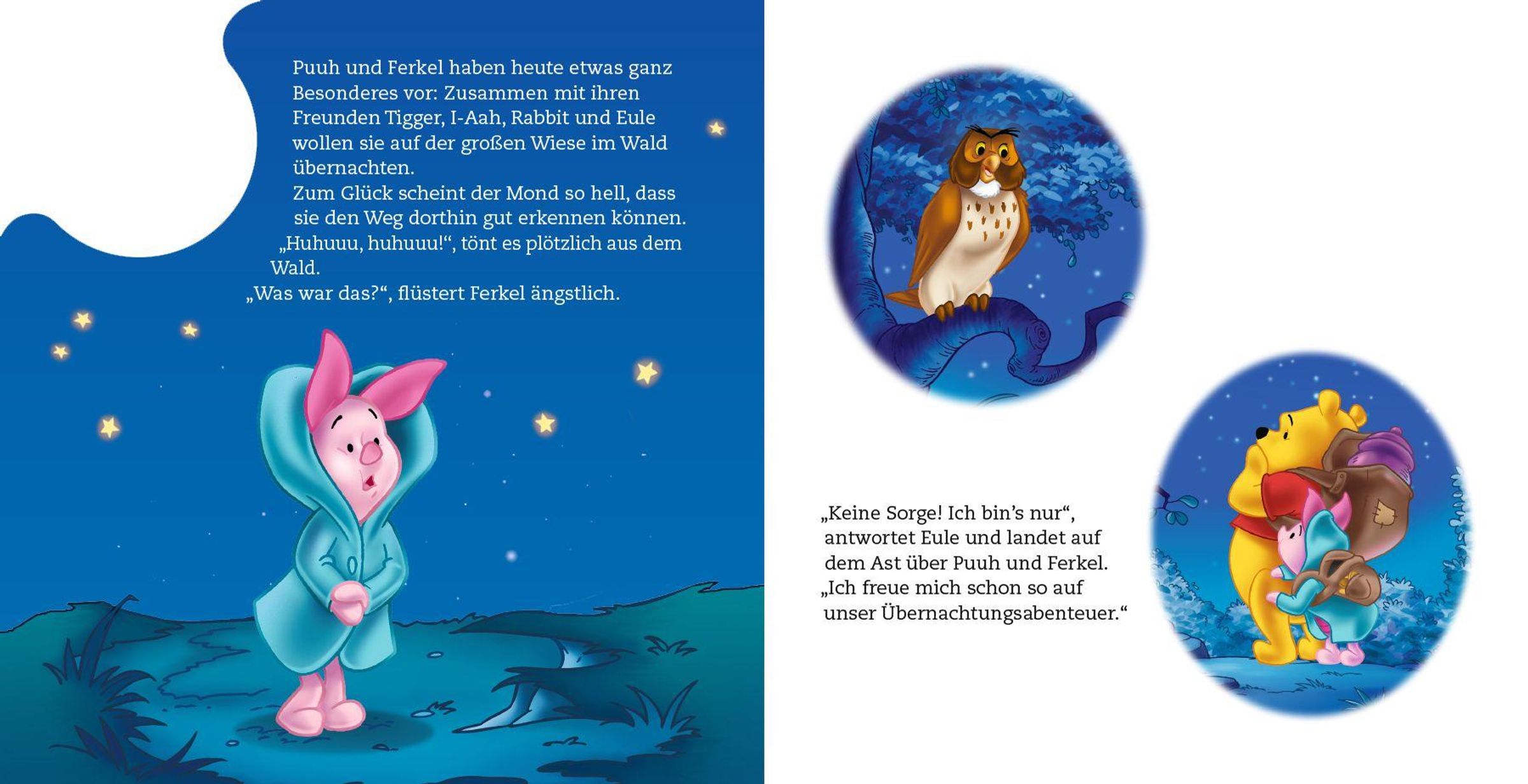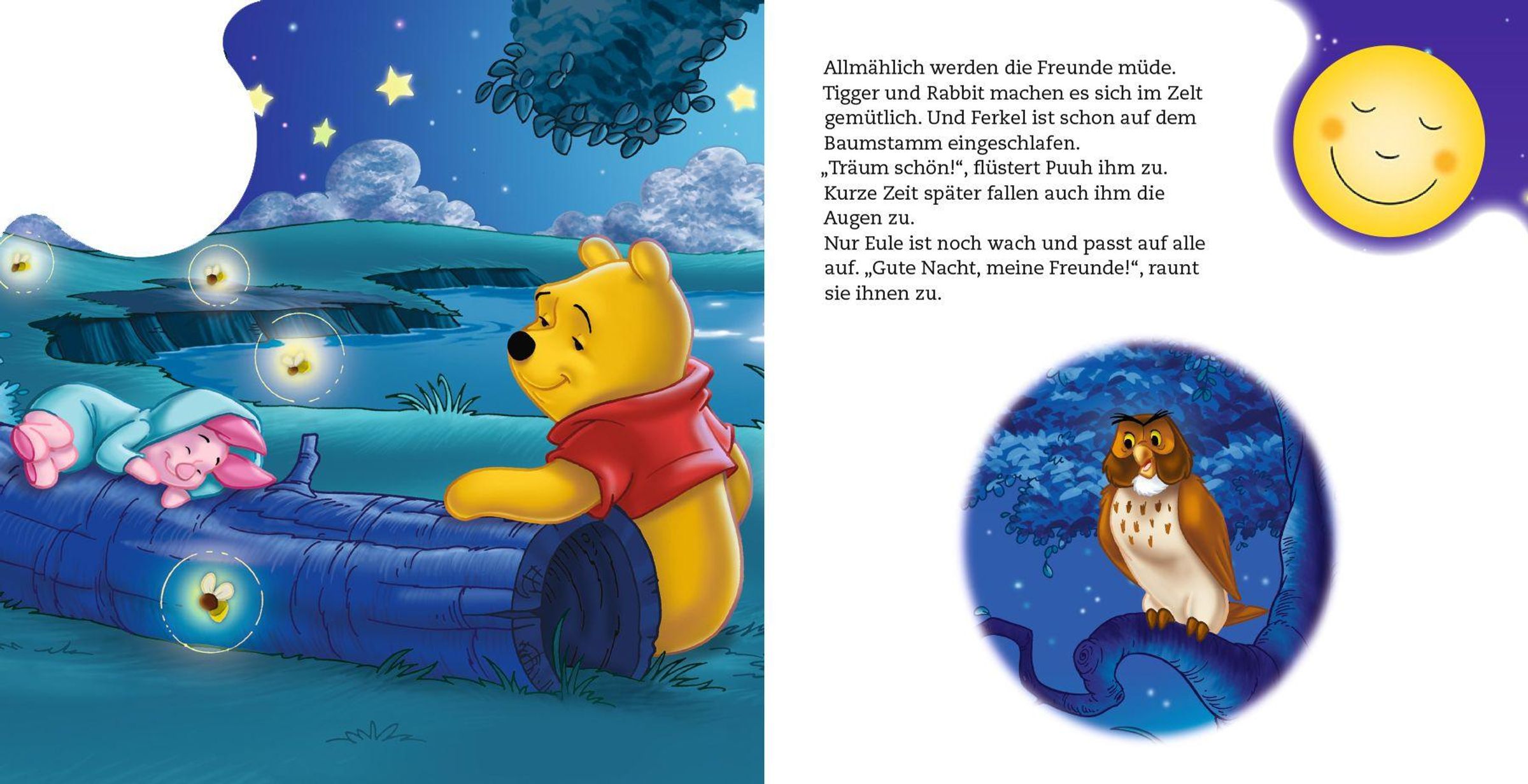 In dieser wunderschönen Geschichte nimmt Winnie Puuh alle nimmermüden Kleinen mit auf einen Ausflug in den Hundertmorgenwald. Denn was gibt es Schöneres, als mit seinen liebsten Freunden ein Abenteuer zu erleben? Und heute haben der kleine Bär und seine Freunde etwas Besonderes vor. Sie wollen auf der großen Wiese im Wald übernachten. Am Lagerfeuer grillen sie Marshmallows und beobachten die lustigen Glühwürmchen, bis sie schließlich ganz müde werden und zufrieden einschlafen ... Eine liebevoll illustrierte Gutenachtgeschichte mit Licht!