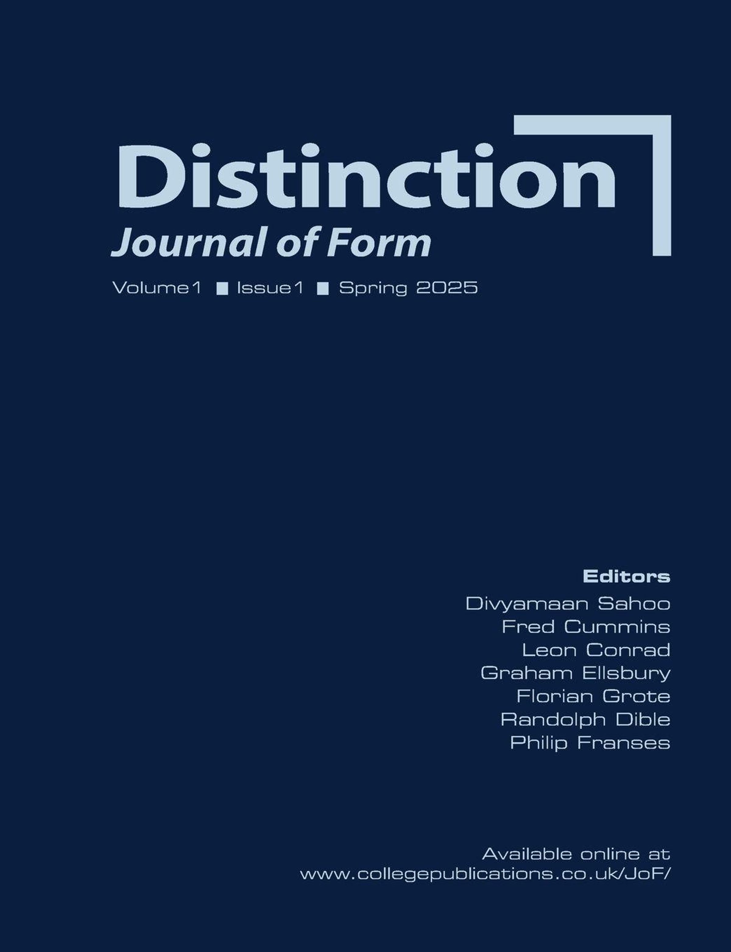 Distinction: Journal of Form, conceived in the context of the Laws of Form conference series (https://lof50.com), offer new work in wide-ranging, transdisciplinary fields, including but not limited to pure mathematics, philosophy, computer science, cybernetics, consciousness studies, phenomenology, psychedelic science, poetry, performance art, theoretical physics, philosophical mysticism, speculative fiction, and other areas.