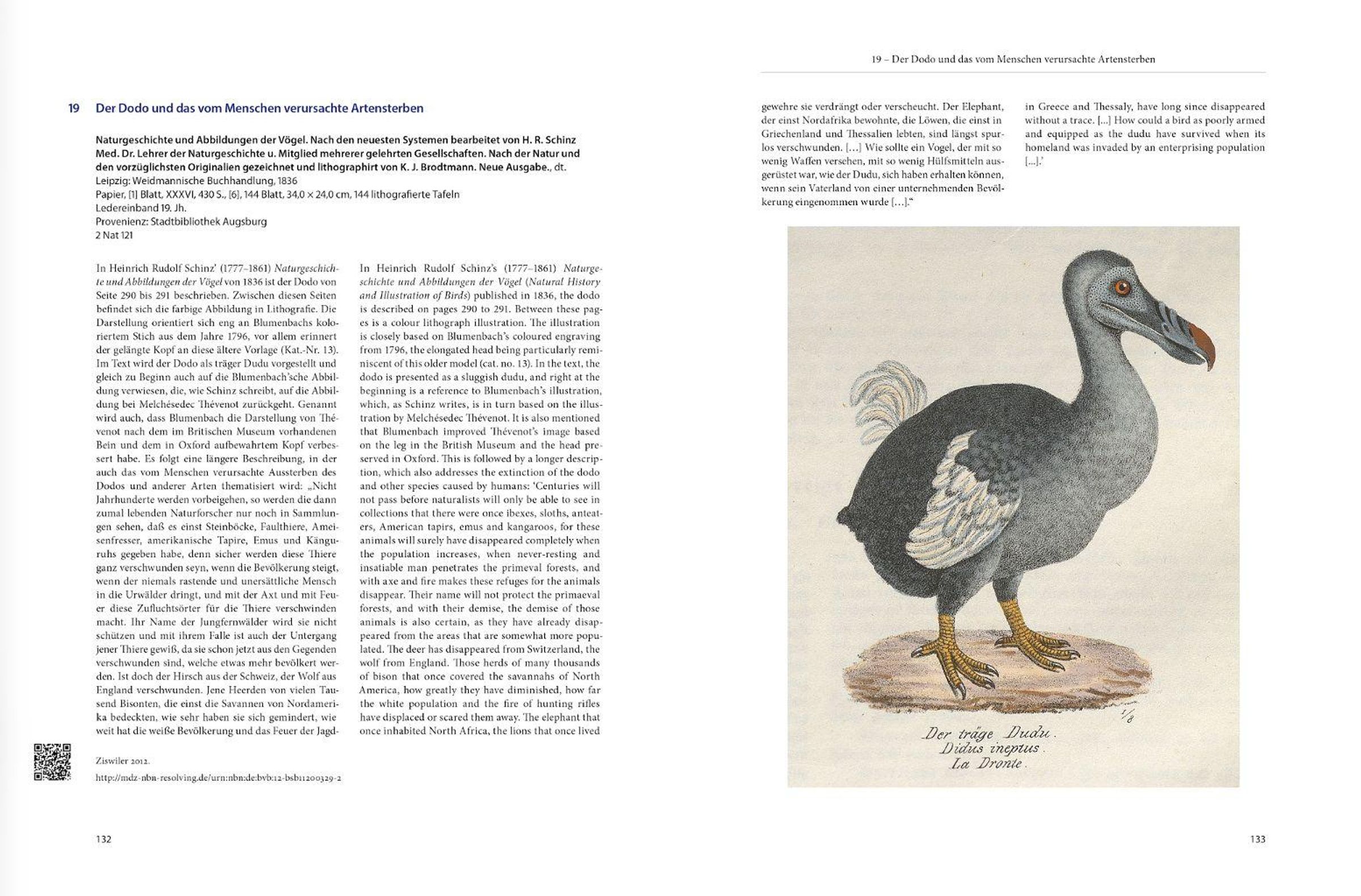 Dieser zeitlose Katalog zur gleichnamigen Ausstellung "Dodo-Paradies" in der Staats- und Stadtbibliothek Augsburg, die vom 6. Mai bis 31. Juli 2026 zu sehen ist, zeigt nicht nur neuere Darstellungen der Dronte oder Raphus cucullatus. Auch die ältesten unter den naturwissenschaftlichen und naturhistorischen Beiträgen zum Dodo werden aus den wertvollen Buchbeständen gezeigt.