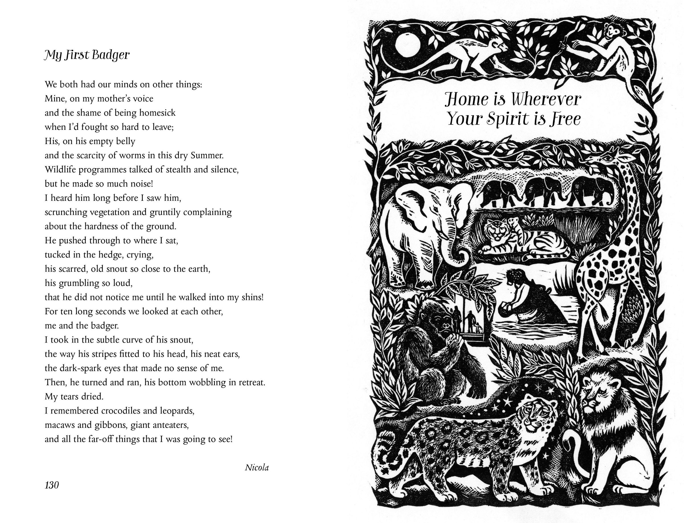 Out There in the Wild celebrates our place in nature. It is packed with poems about everything that lives in the the sea and rivers, on land and in the sky. You will meet eagles and skylarks, tigers and elephants, foxes, rabbits and bats, bees and butterflies and many other natural wonders.