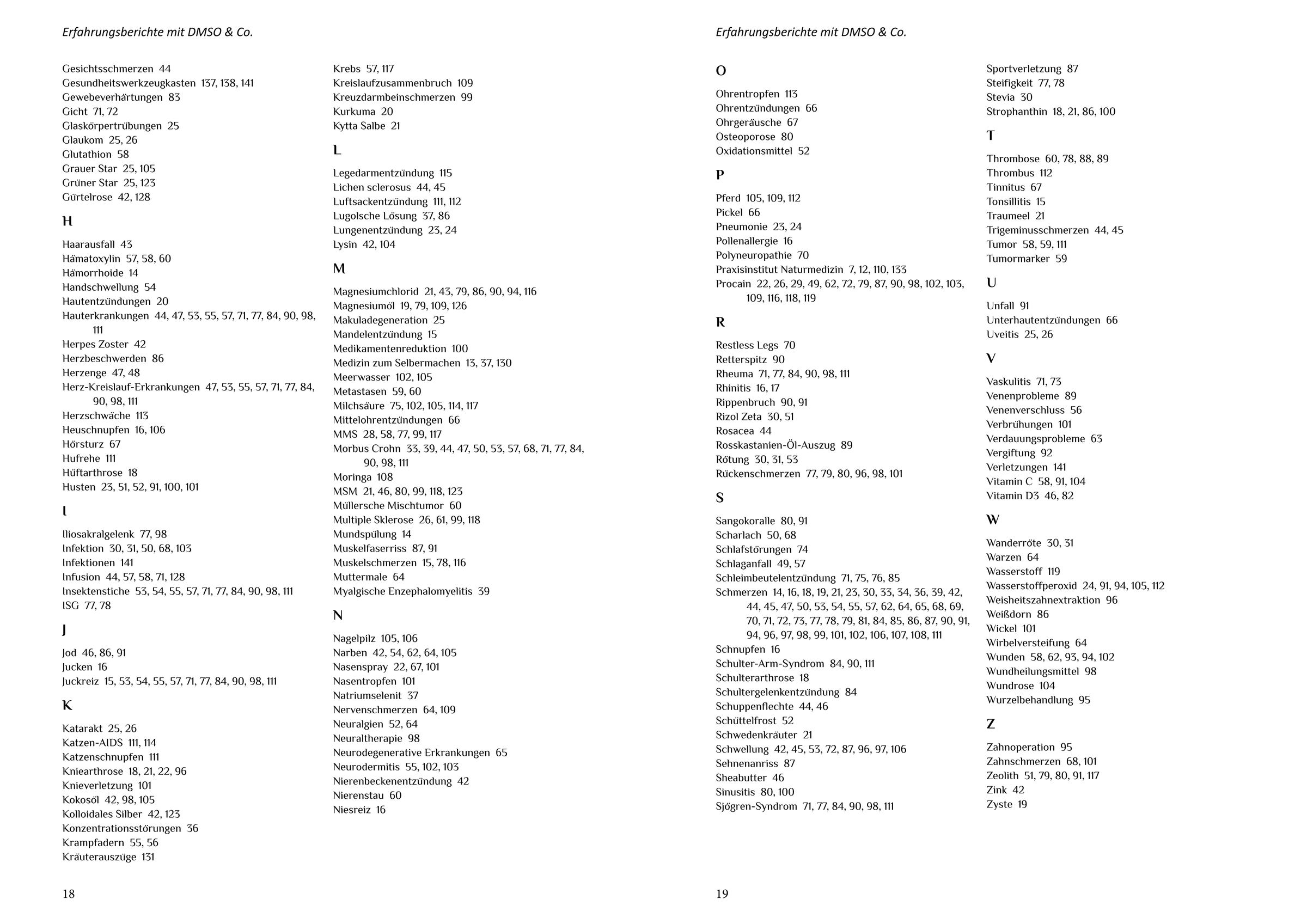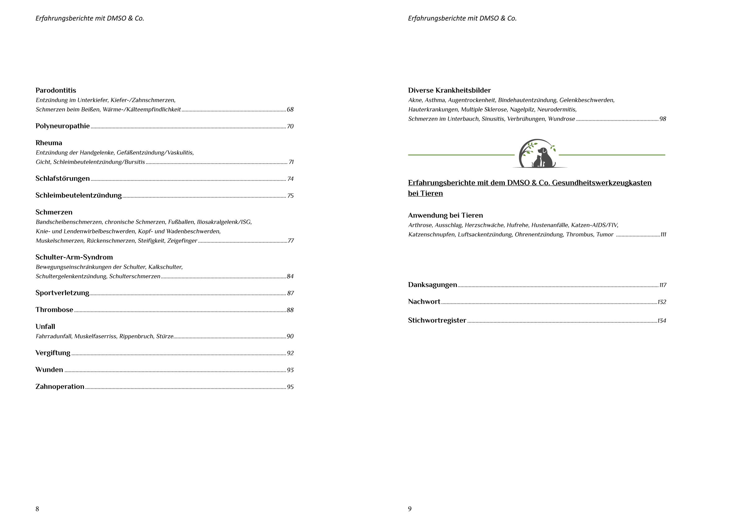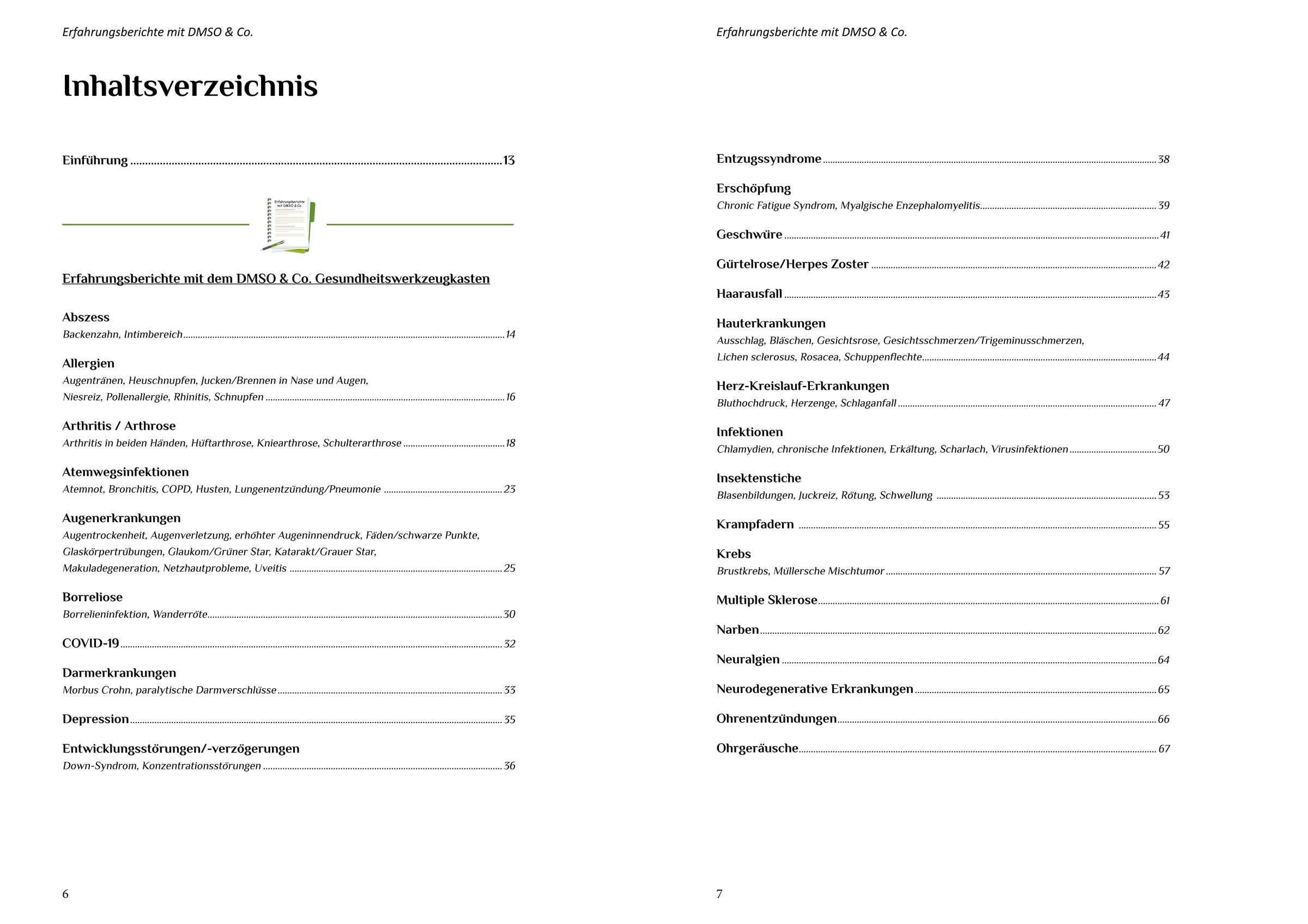 Das bietet Ihnen das Buch ¿Erfahrungsberichte mit DMSO & Co.¿: ¿ Umfangreiche Sammlung von über 200 Erfahrungsberichten auf über 140 Seiten mit über 250 Abbildungen zum praktischen Gesundheitswerkzeugkasten DMSO & Co. ¿ Erfahrungsberichte zu Verletzungen, Symptomen des Bewegungsapparates sowie der Haut bis hin zu akuten und chronischen Infektionen, Allergien und Ablagerungserkrankungen ¿ Wertvolle Anwendertipps zu einfachen, bewährten und hochwirksamen Mitteln wie Borax, CDL, Kolloidales Silber, Lugolsche Lösung, MMS, Wasserstoffperoxid, ¿ ¿ Erstaunliche Heilungsvorgänge mit dem hocheffektiven Gesundheitswerkzeugkasten DMSO & Co.. Die Fallberichte reichen von Verletzungen, Symptomen des Bewegungsapparates und der Haut bis hin zu akuten und chronischen Infektionen, Allergien und Ablagerungserkrankungen