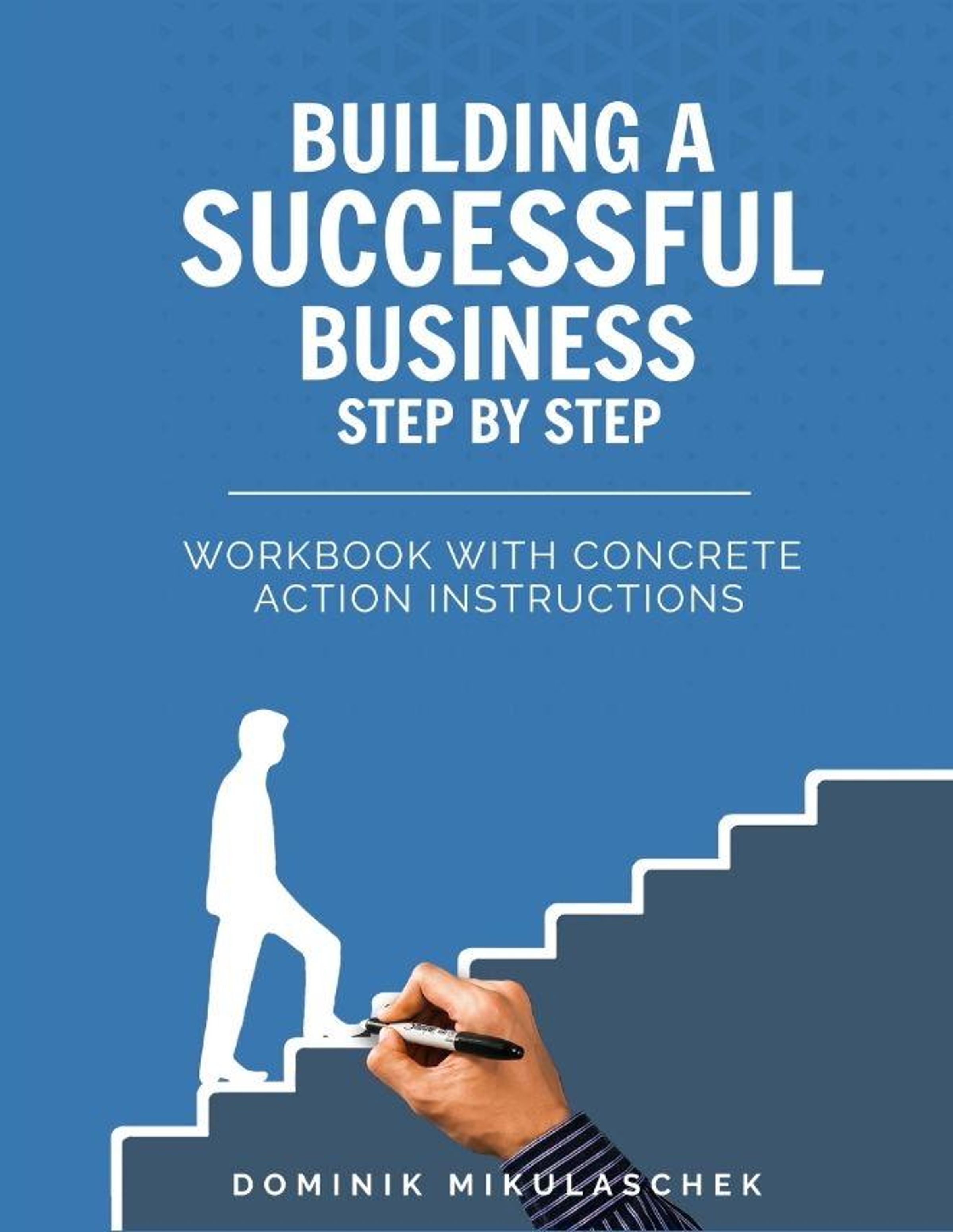 "Building a Successful Business Step by Step. Workbook with Concrete Action Instructions. Dominik Mikulaschek." Eine Hand zeichnet Treppen., Buch