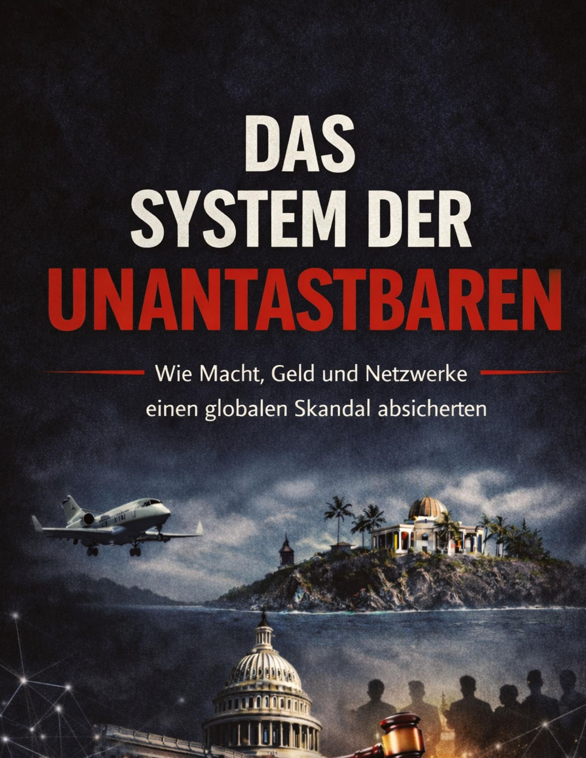 Text: "Das System der Unantastbaren. Wie Macht, Geld und Netzwerke einen globalen Skandal absicherten." Illustration: Flugzeug, Insel, Kuppelgebäude, Silhouetten., Buch