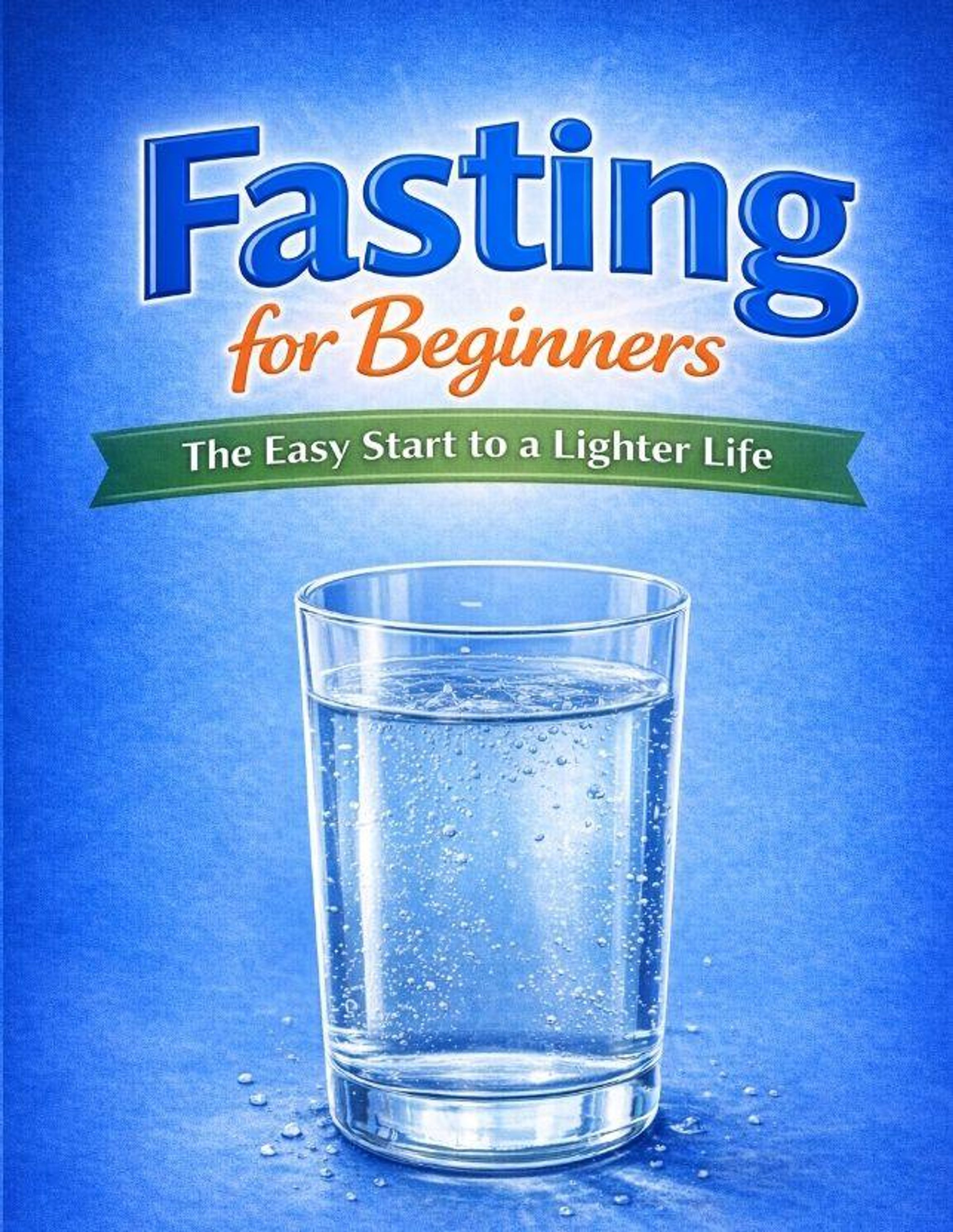 "Fasting for Beginners" und "The Easy Start to a Lighter Life" erscheinen über einem Glas Wasser., Buch