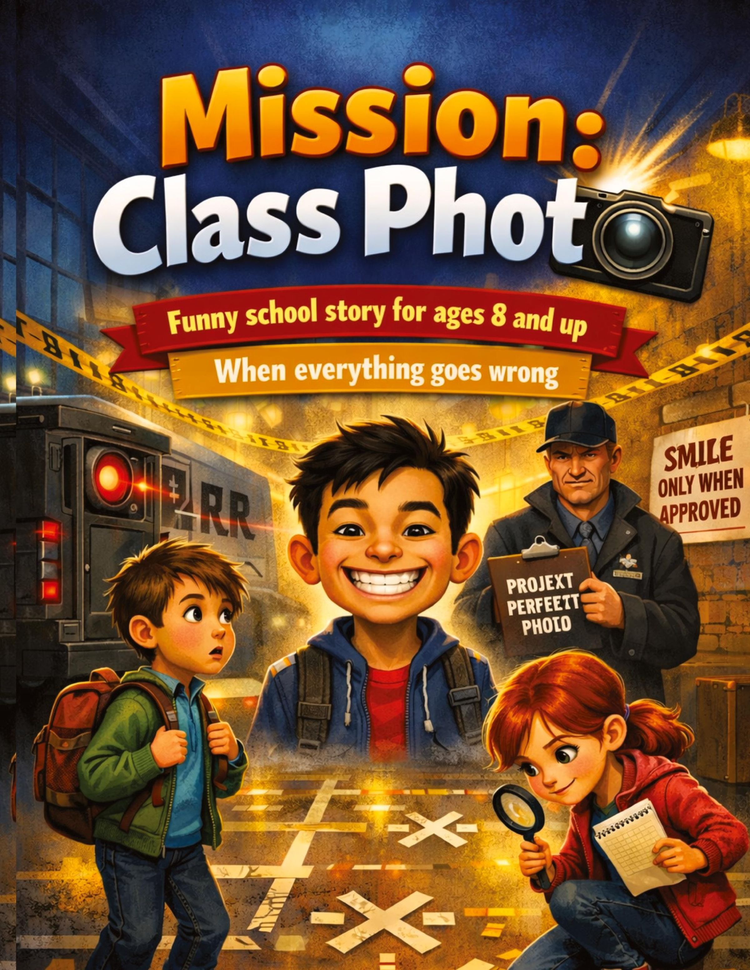 Buchtitel: "Mission: Class Photo". Untertitel: "Funny school story for ages 8 and up. When everything goes wrong." Illustration., Buch
