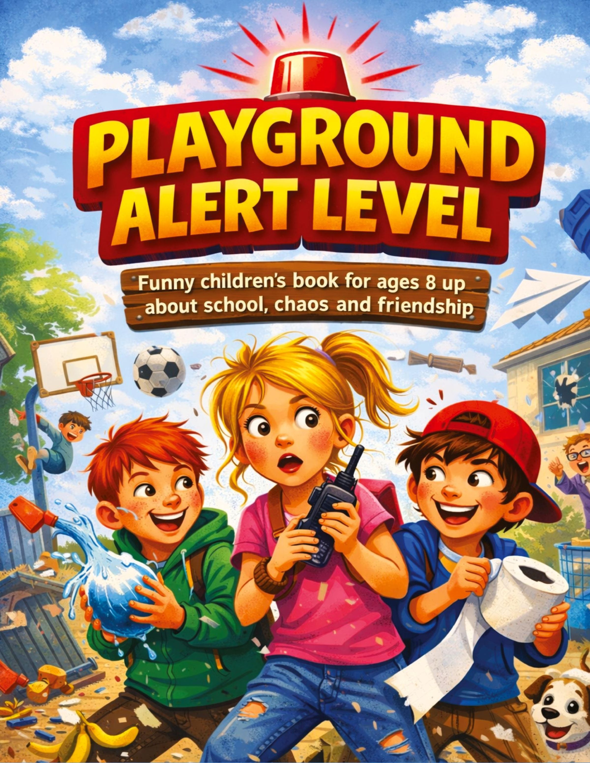 "PLAYGROUND ALERT LEVEL" steht groß auf einem Schild. Kinder mit Wasserballon, Funkgerät und Toilettenpapier wirken chaotisch., Buch