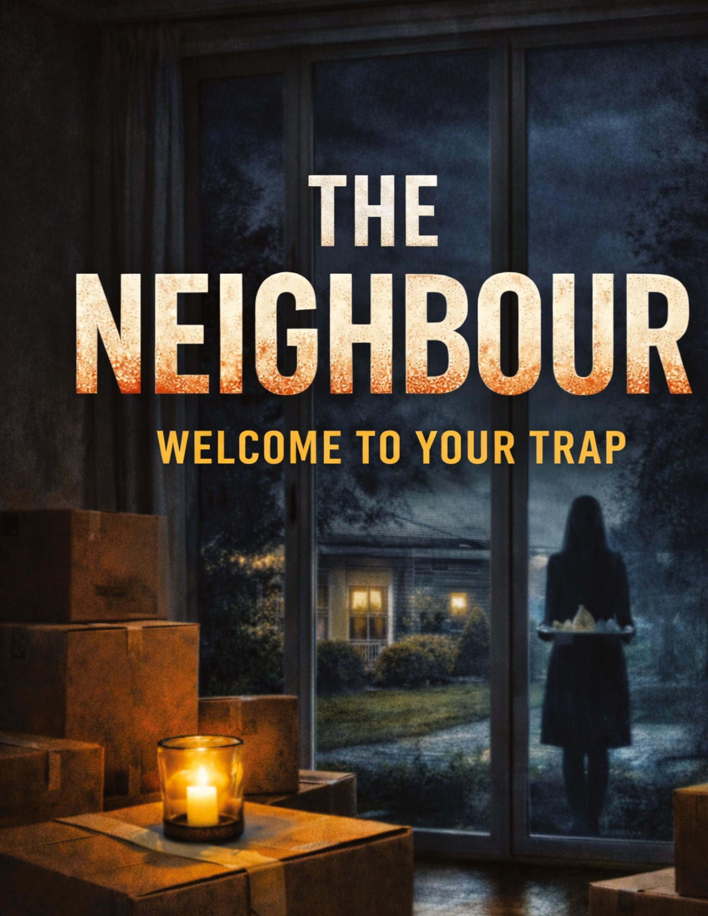 "The Neighbour", "Welcome to Your Trap" in großen Lettern, viele Umzugskartons, Kerze, dunkle Gestalt am Fenster mit Tablett., Buch