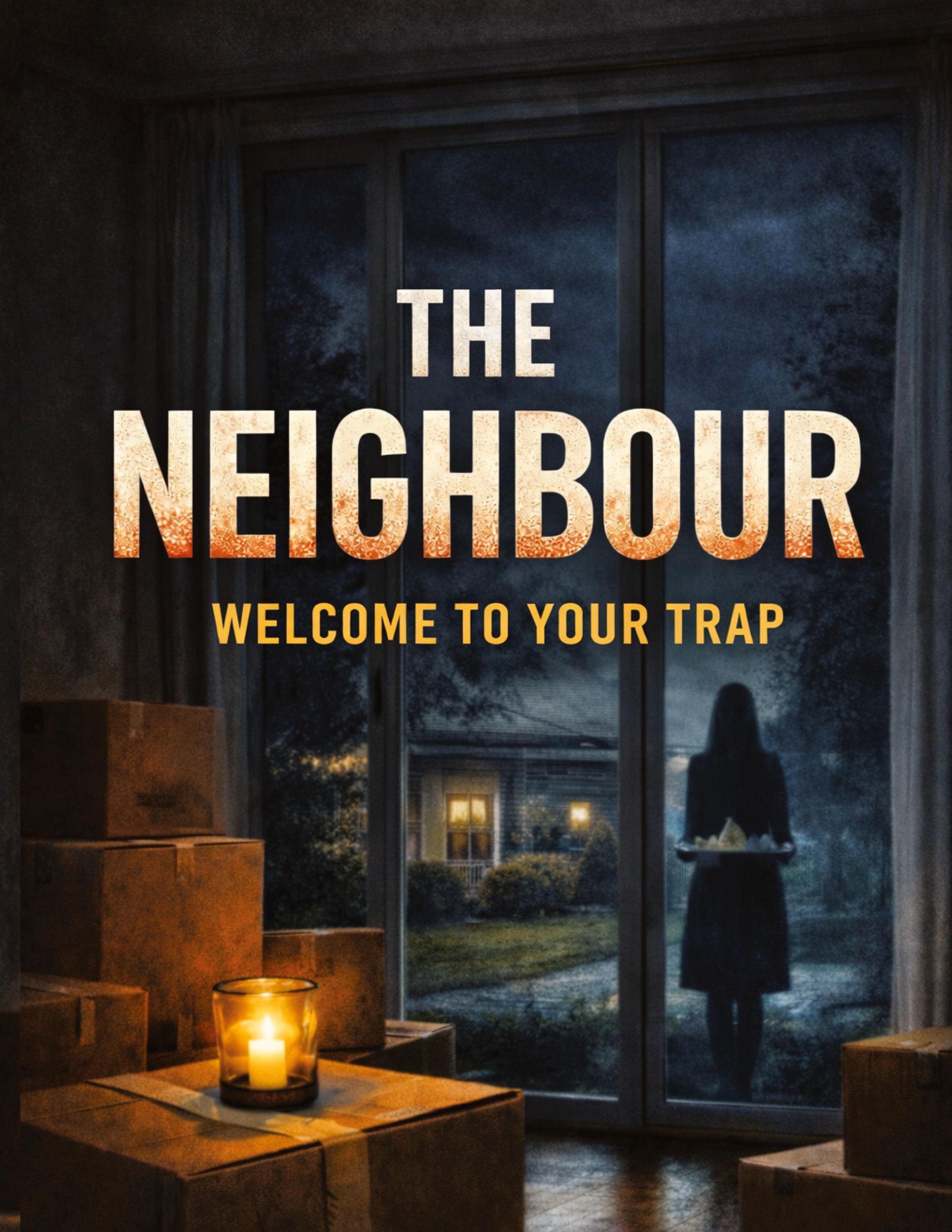 Text: "The Neighbour" und "Welcome to Your Trap". Eine brennende Kerze auf Kartons, dunkle Gestalt an einer Glastür., Buch