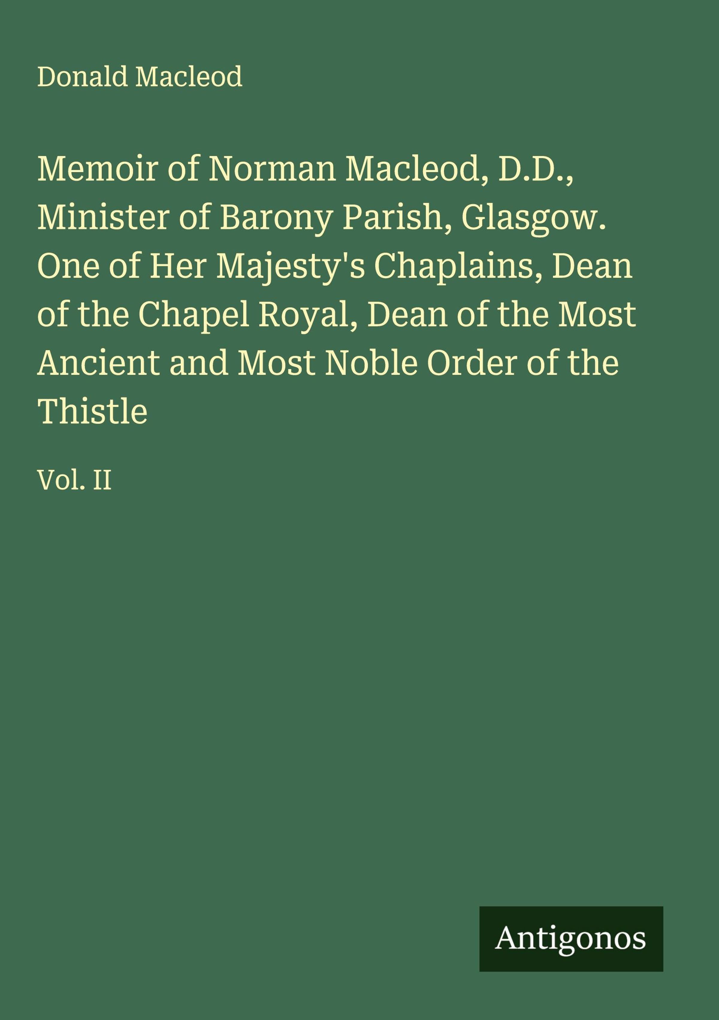 Memoir of Norman Macleod, D.D., Minister of Barony Parish, Glasgow. One of Her Majesty's Chaplains, Dean of the Chapel Royal, Dean of the Most Ancient and Most Noble Order of the Thistle