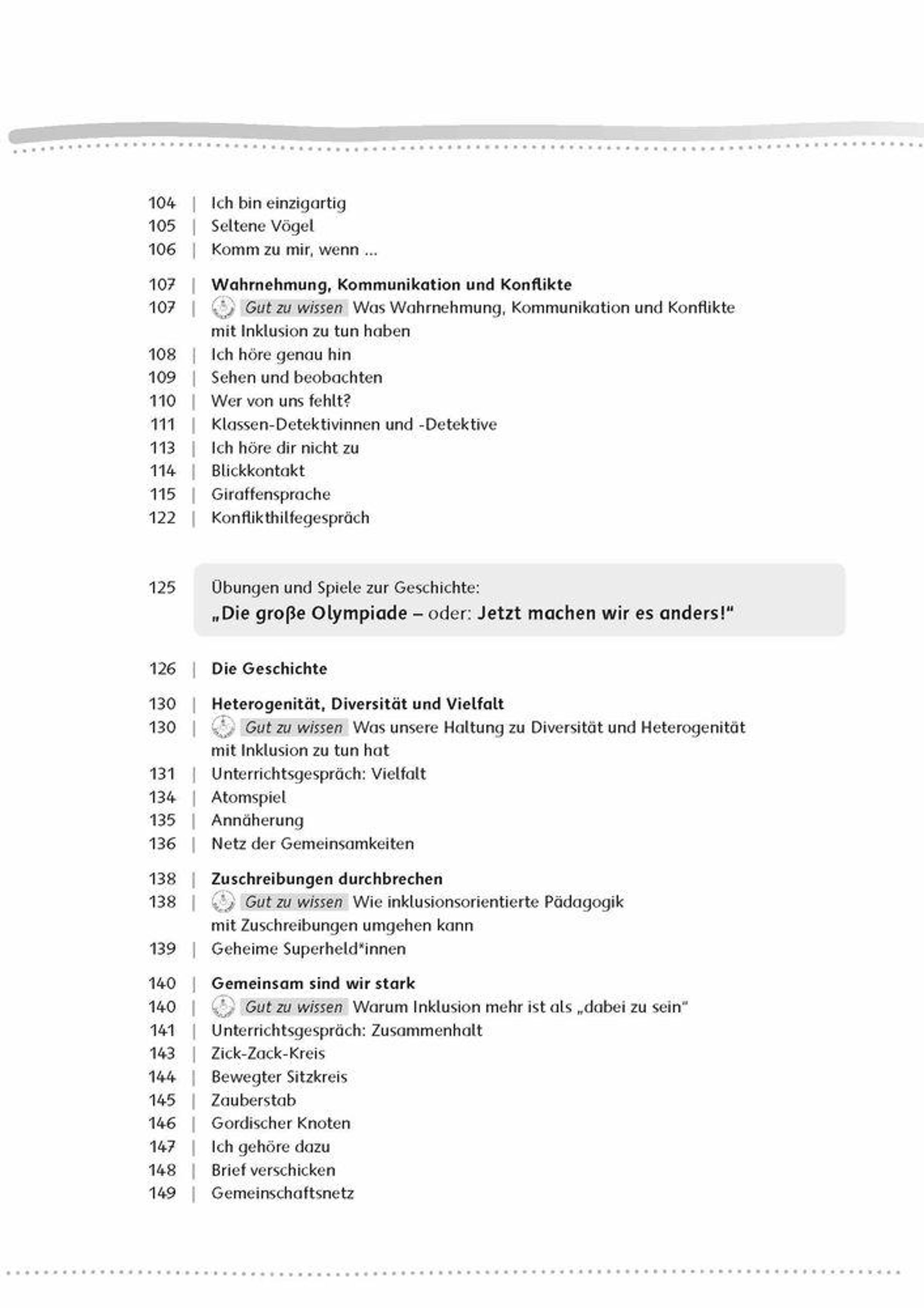 Themen sind unter anderem: Diversität und Inklusion , Gefühle und Bedürfnisse, Selbstbild und Anderssein, Empathie und Mitgefühl, Vorurteile und Ausgrenzung, Kooperation und Konfliktlösung im Team, Gemeinschaftsgefühl und Zusammenhalt.