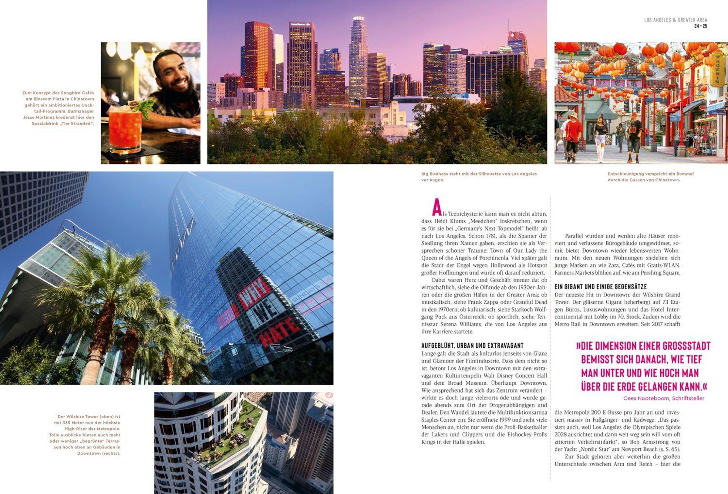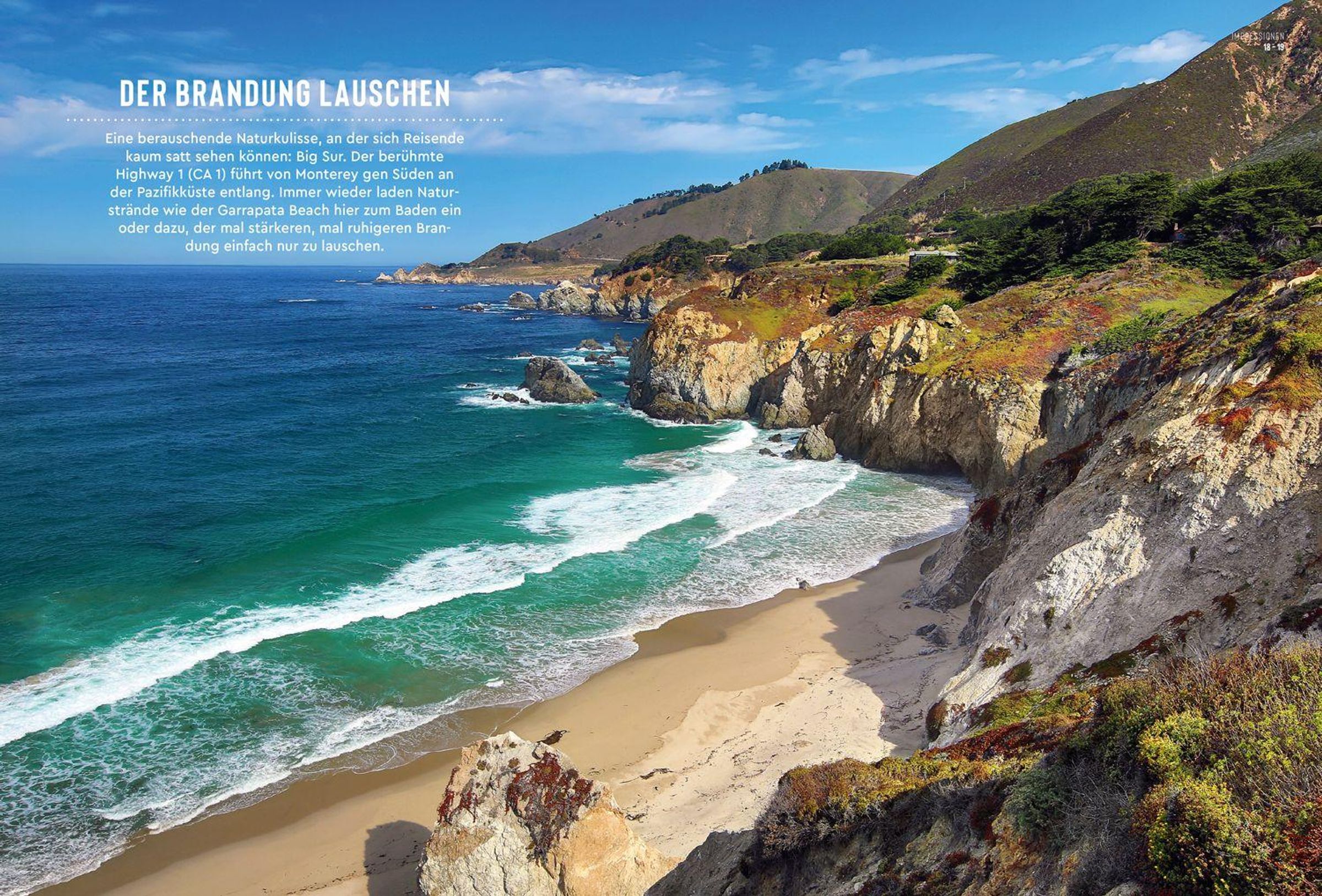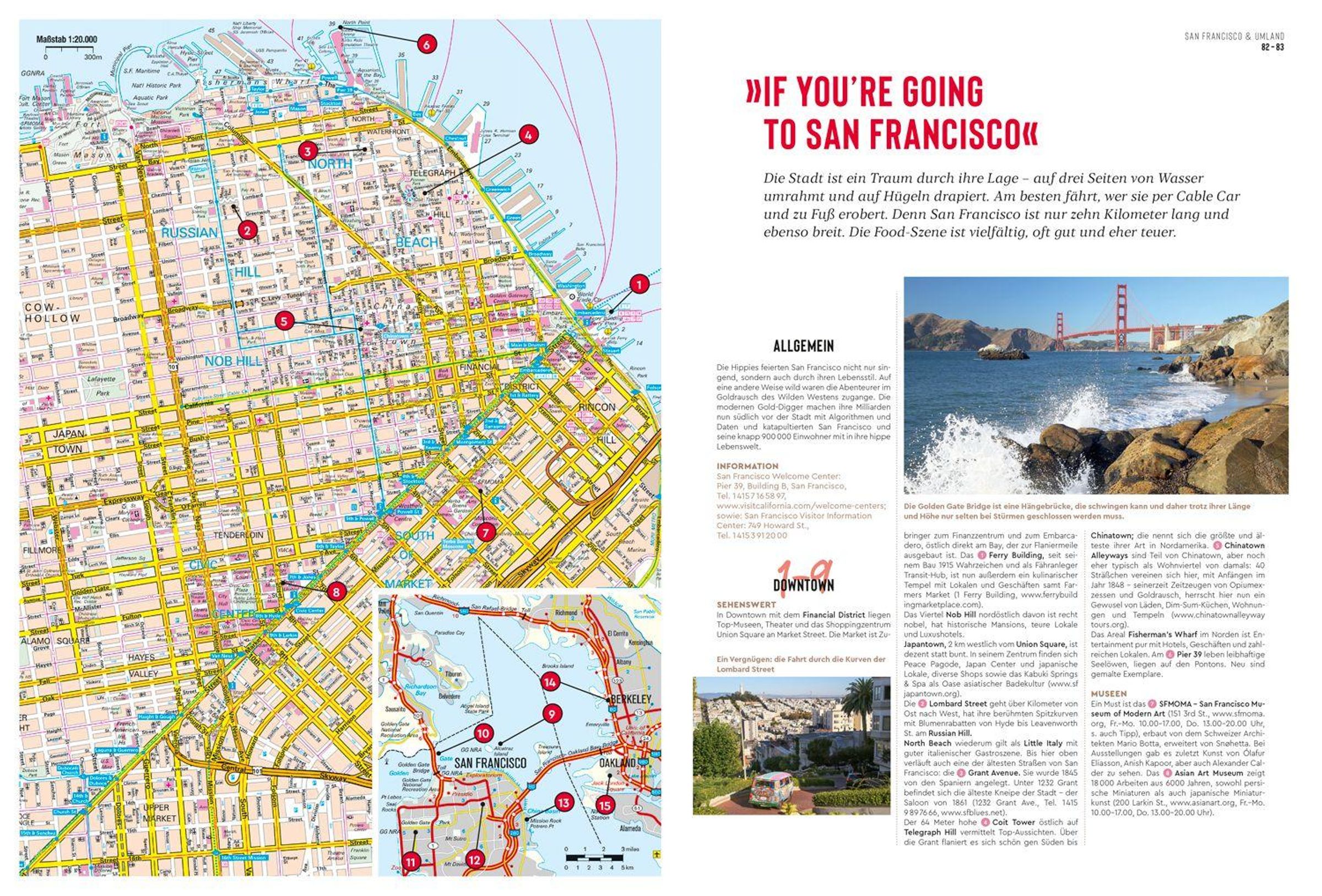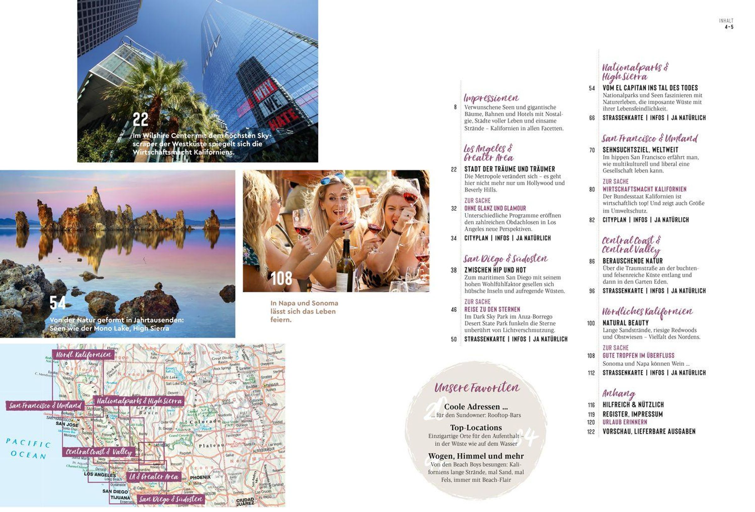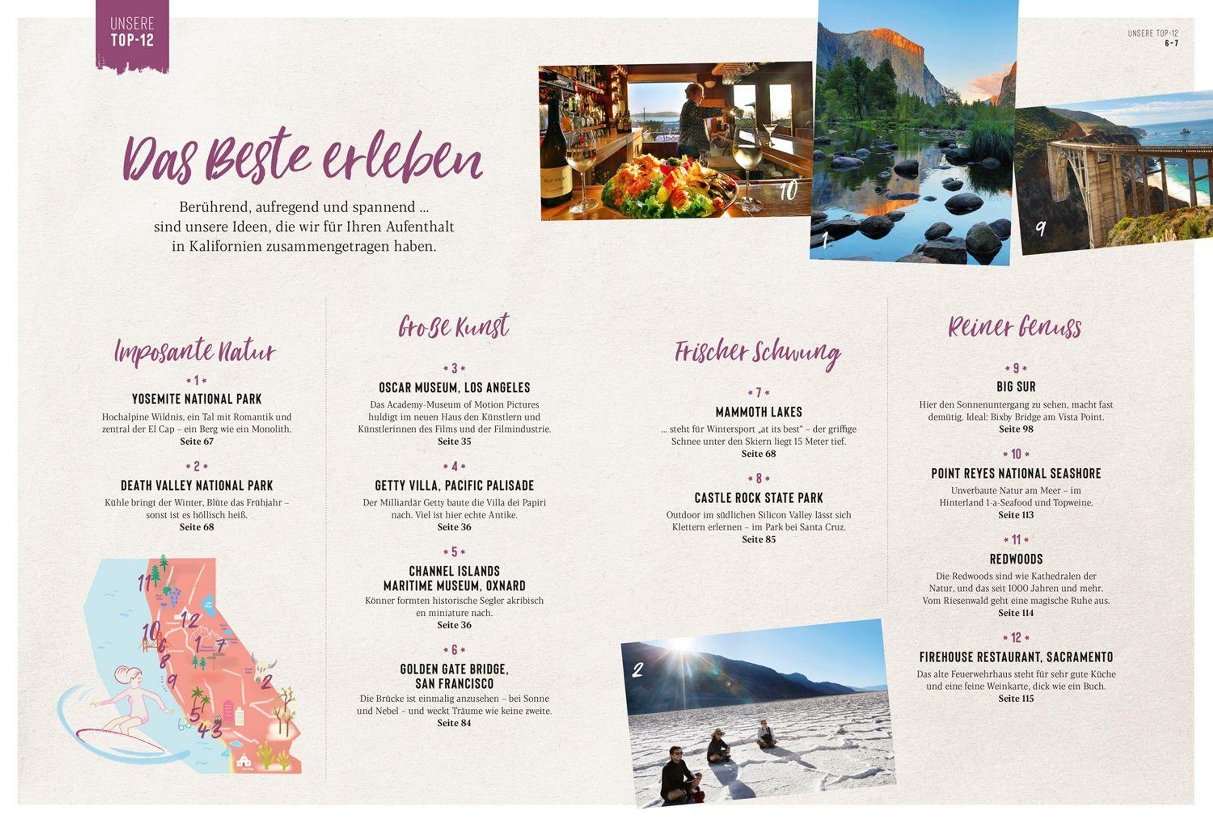 Einmal im Leben möchte man dort gewesen sein, in San Francisco, in Los Angeles, im Yosemite National Park, an einem der Strände des Big Sur. Wir stellen alle kalifornischen Sehnsuchtsziele ausführlich in Wort und mit eindrucksvollen ganz aktuellen Bildern vor. Und wir halten viele tolle Überraschungen bereit: Wenn die Sonne im Meer versinkt, sind Open Air Bars an der Küste besonders gefragt - die schönsten präsentieren wir. Und auch ein guter Wein mundet mit Meerblick hervorragend, doch wie erklärt sich die Qualität der guten Tropfen aus dem Napa Valley - in der Rubrik "Zur Sache" gehen wir der Frage nach.