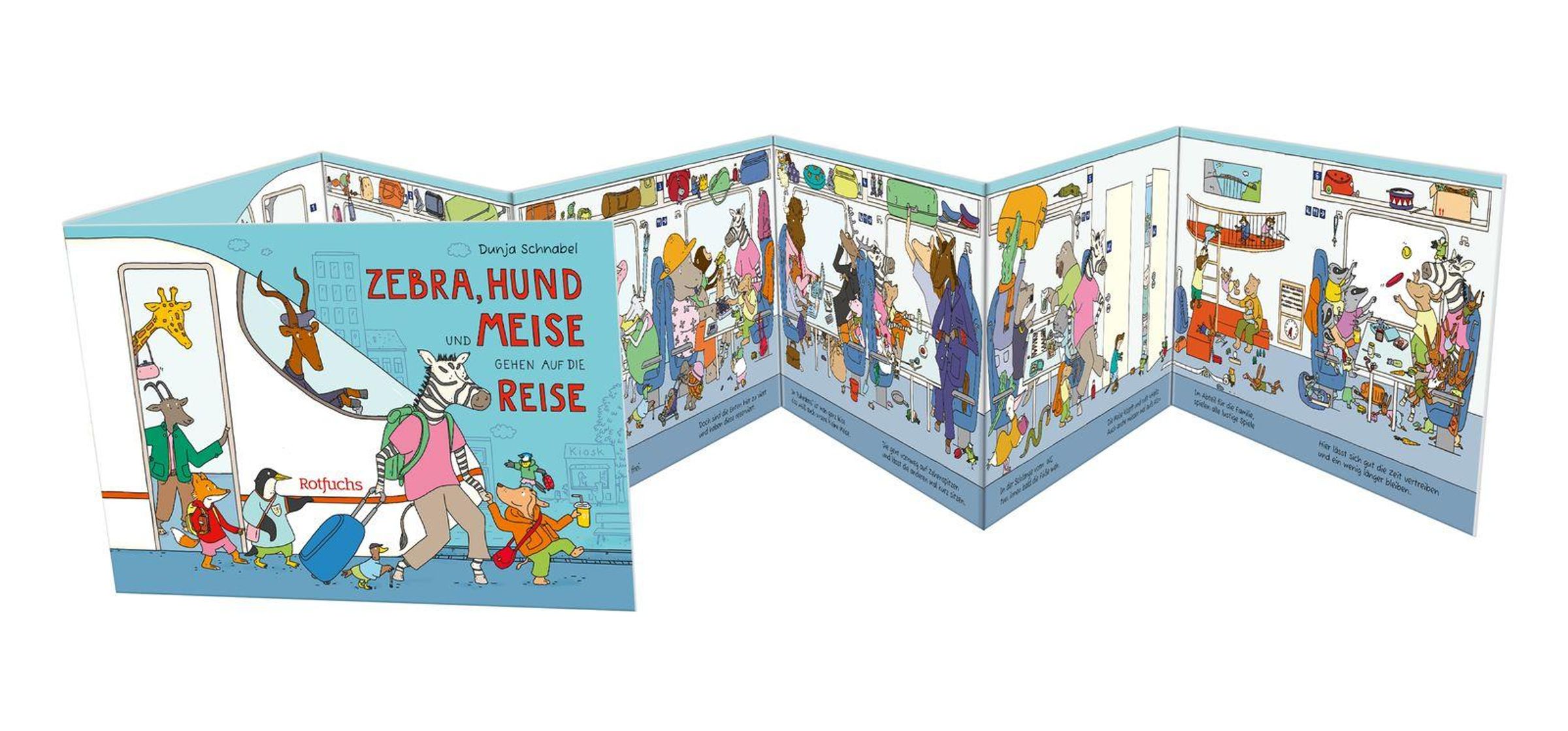 Dunja Schnabel: Zebra, Hund und Meise gehen auf die Reise. Eisenbahn-Leporello, Pappe