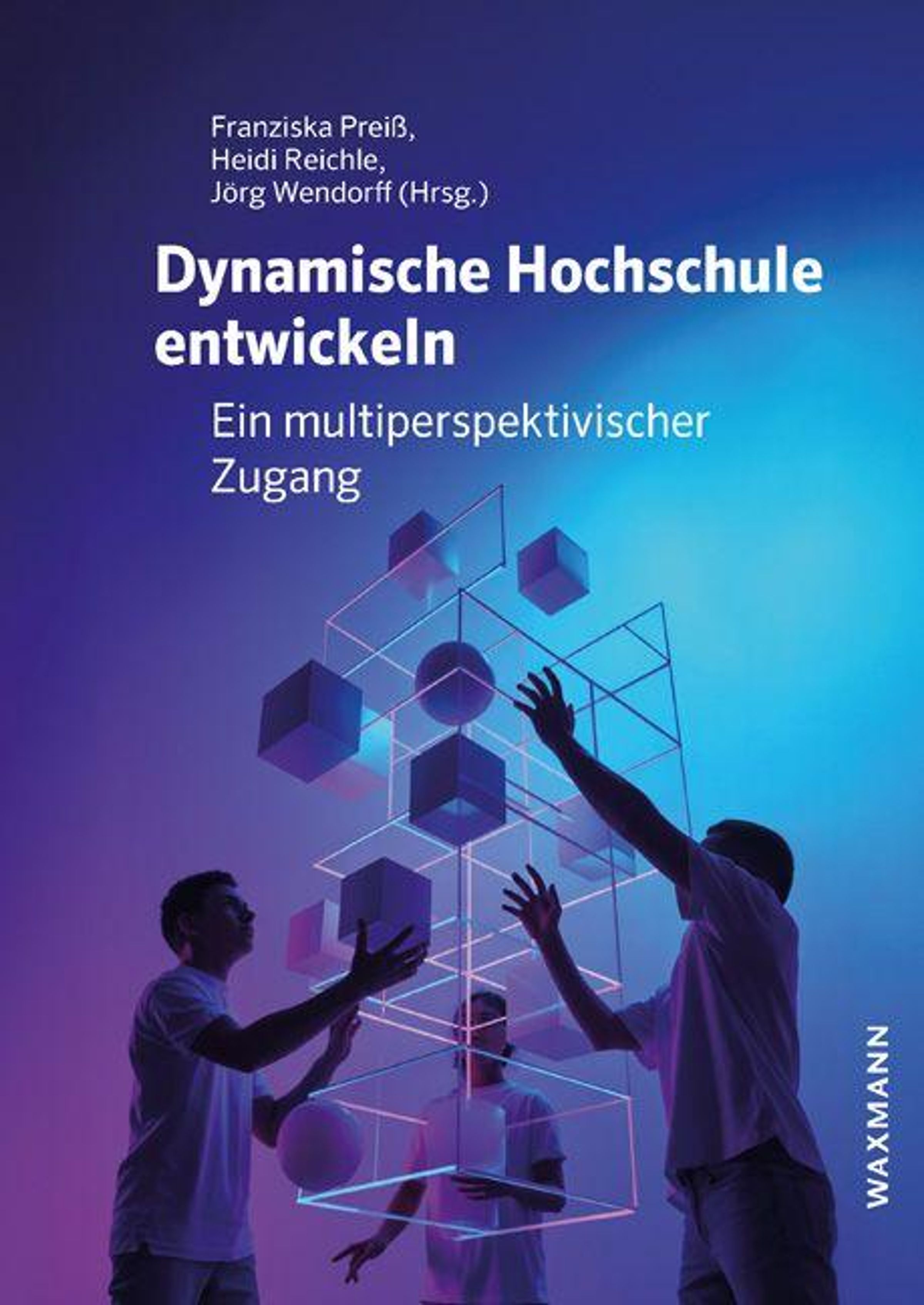 "Dynamische Hochschule entwickeln. Ein multiperspektivischer Zugang." Silhouetten vor schwebenden 3D-Würfeln in Blau., Buch
