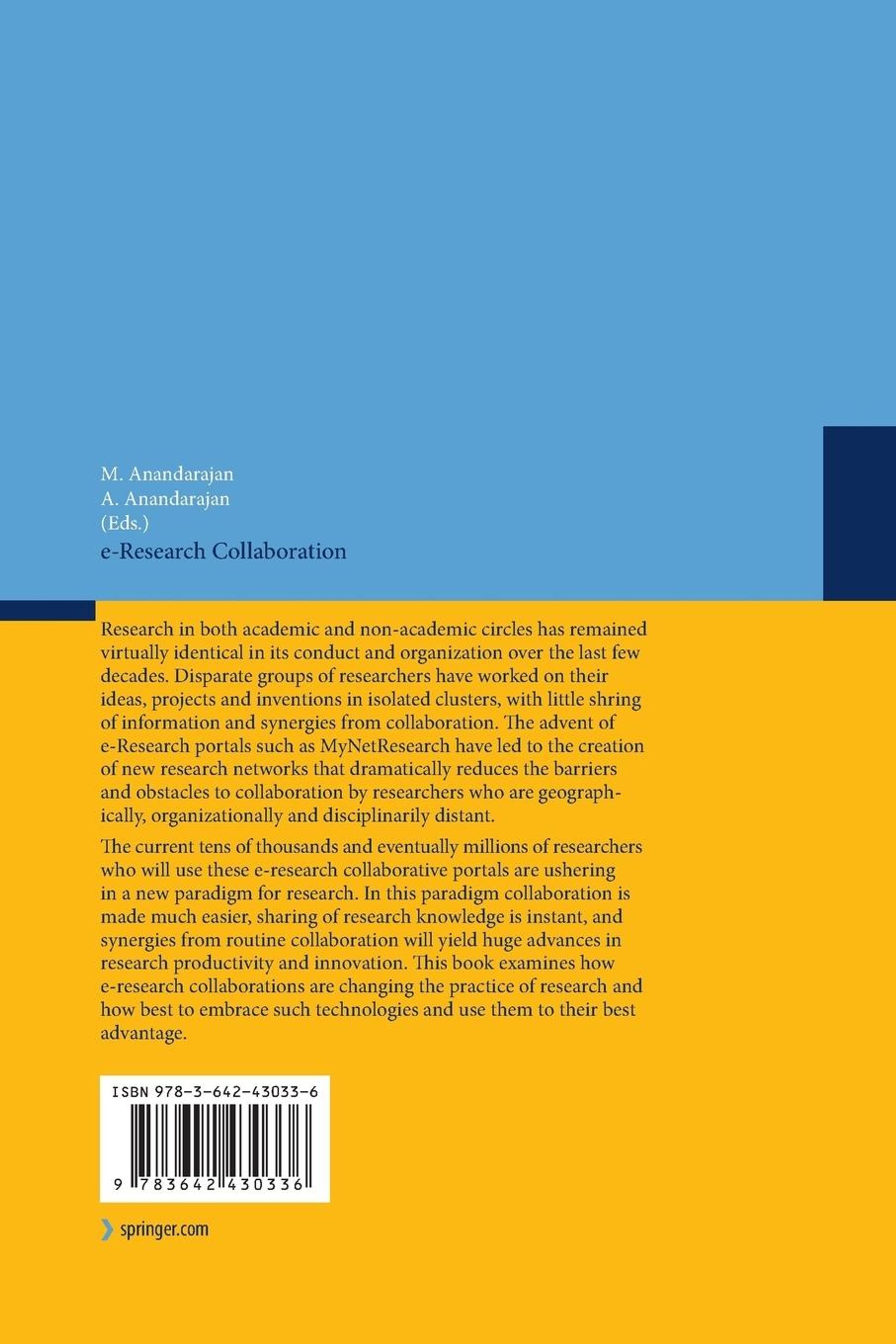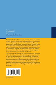 e-Research Collaboration: Theory.- An Overview of e-Research Collaboration.- An Anatomy of Collaboration Within the Online Environment.- Time, Place and Cyberspace: Foundations for Successful e-Research Collaboration.- Gaps and Bridges in Interdisciplinary Knowledge Integration.- Building a Conceptual Framework for Creating New Knowledge Through a Virtual Interdisciplinary Environment Process.- e-Research Collaboration: Technologies.- Serverless Social Software for Nomadic Collaboration.- A Taxonomy of e-Research Collaboration Tools: Using Web 2.0 to Connect, Collaborate and Create with Research Partners.- Blogging to Accelerate Peer Review of Doctoral Dissertations.- The Butterfly Effect: An Approach to Web-Based Scientific Data Distribution and Management with Linkages to Climate Data and the Semantic Web.- Collaboration Among e-Research Projects in the UK: An Analysis Using Online Research Methods.- e-Research in International Cooperation Networks in Science and Technology Research.- Wikis in Design Engineering Research.- Shifting the Research Grant Collaboration Paradigm with Research 2.0.- Doctoral Programs in the Age of Research 2.0.- e-Research Collaboration: Challenges.- Issues Related to Research Ethics in e-Research Collaboration.- The Coming "République des Lettres".- E-Research Collaboration and the Free-Rider Problem: Communication Solutions to Social Dilemmas in Computer Mediated Research Collaborations.- Knowledge Sharing by Web 2.0 in Real Estate and Construction Discipline.- Creation of Social Capital in a Web Based Virtual Research Environment.