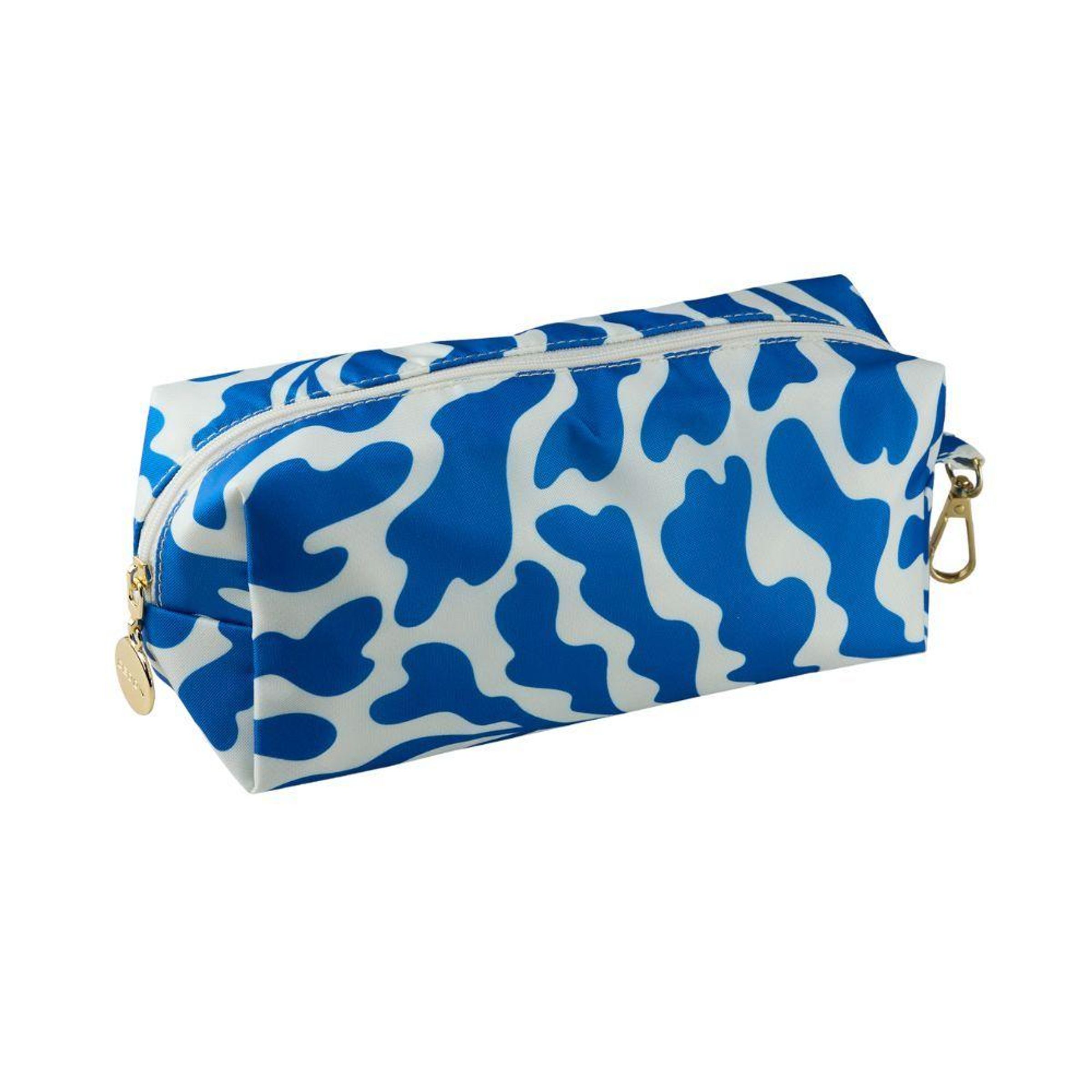 Eine rechteckige Tasche mit weißem Hintergrund und blauen, wellenförmigen Flecken. Goldene Details wie Reißverschluss und Anhänger., Diverse