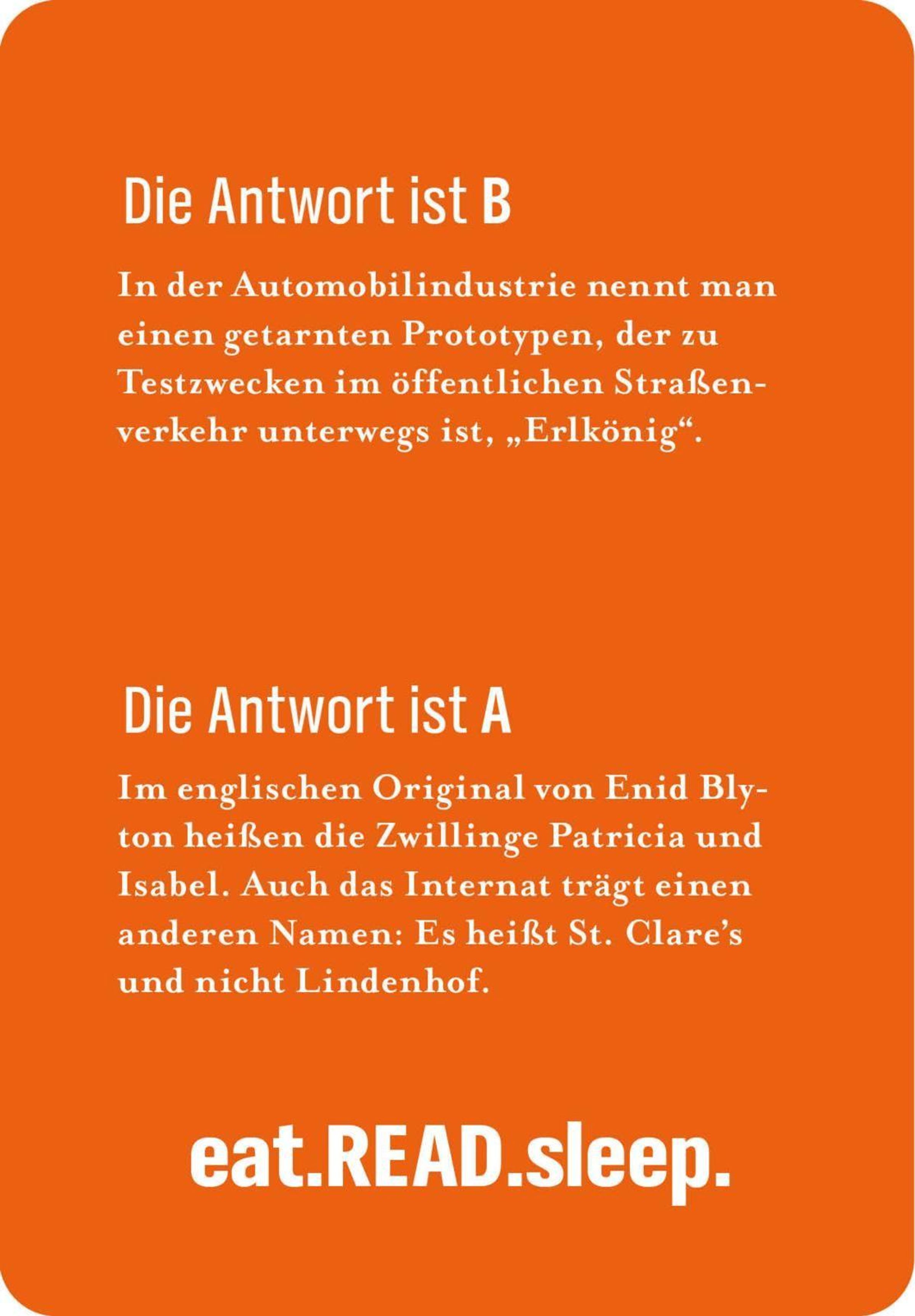 Über 200 Fragen auf 100 Karten laden dazu ein, in die Welt der Bücher einzutauchen. Von klassischen Werken bis zu modernen Bestsellern - hier wird das Bücherwissen auf unterhaltsame Weise getestet. Das Kartenspiel verbindet Rätselspaß mit literarischen Entdeckungen und sorgt für kurzweilige Stunden in geselliger Runde. Fans des Podcasts eat. READ. sleep können hier ihr Wissen aus über 160 Podcastfolgen testen, doch auch alle anderen Literaturbegeisterten kommen voll auf ihre Kosten.