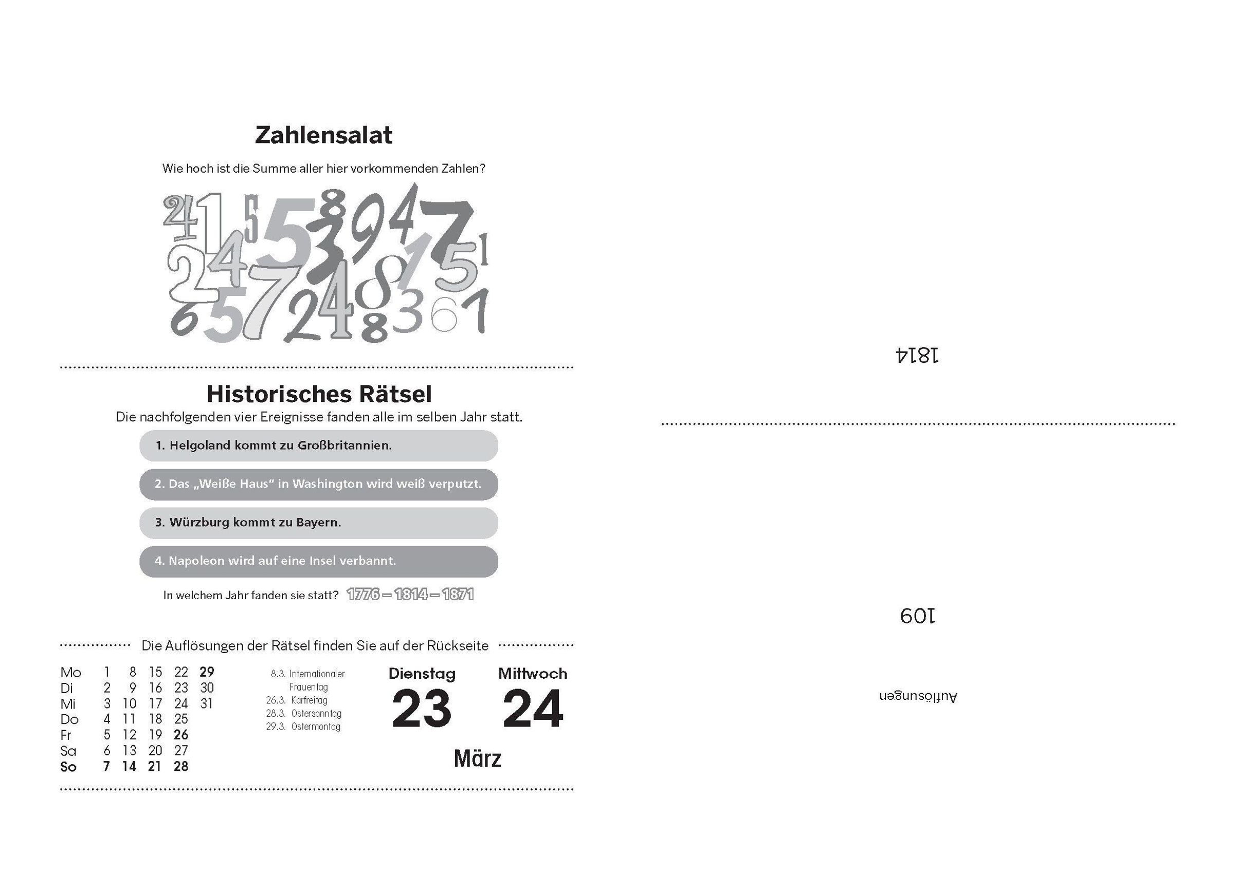- Der Abreißkalender mit Rätseln, Qizfragen, Logik-, Geometrie-, Mathematikrätseln und Denkspielen