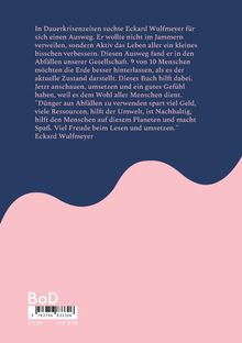 In Dauerkrisenzeiten suchte Eckard Wulfmeyer für sich einen Ausweg. Er wollte nicht im Jammern verweilen, sondern Aktiv das Leben aller ein kleines bisschen verbessern. Diesen Ausweg fand er in den Abfällen unserer Gesellschaft. 9 von 10 Menschen möchten die Erde besser hinterlassen, als es der aktuelle Zustand darstellt. Dieses Buch hilft dabei. Jetzt anschauen, umsetzen und ein gutes Gefühl haben, weil es dem Wohl aller Menschen dient.