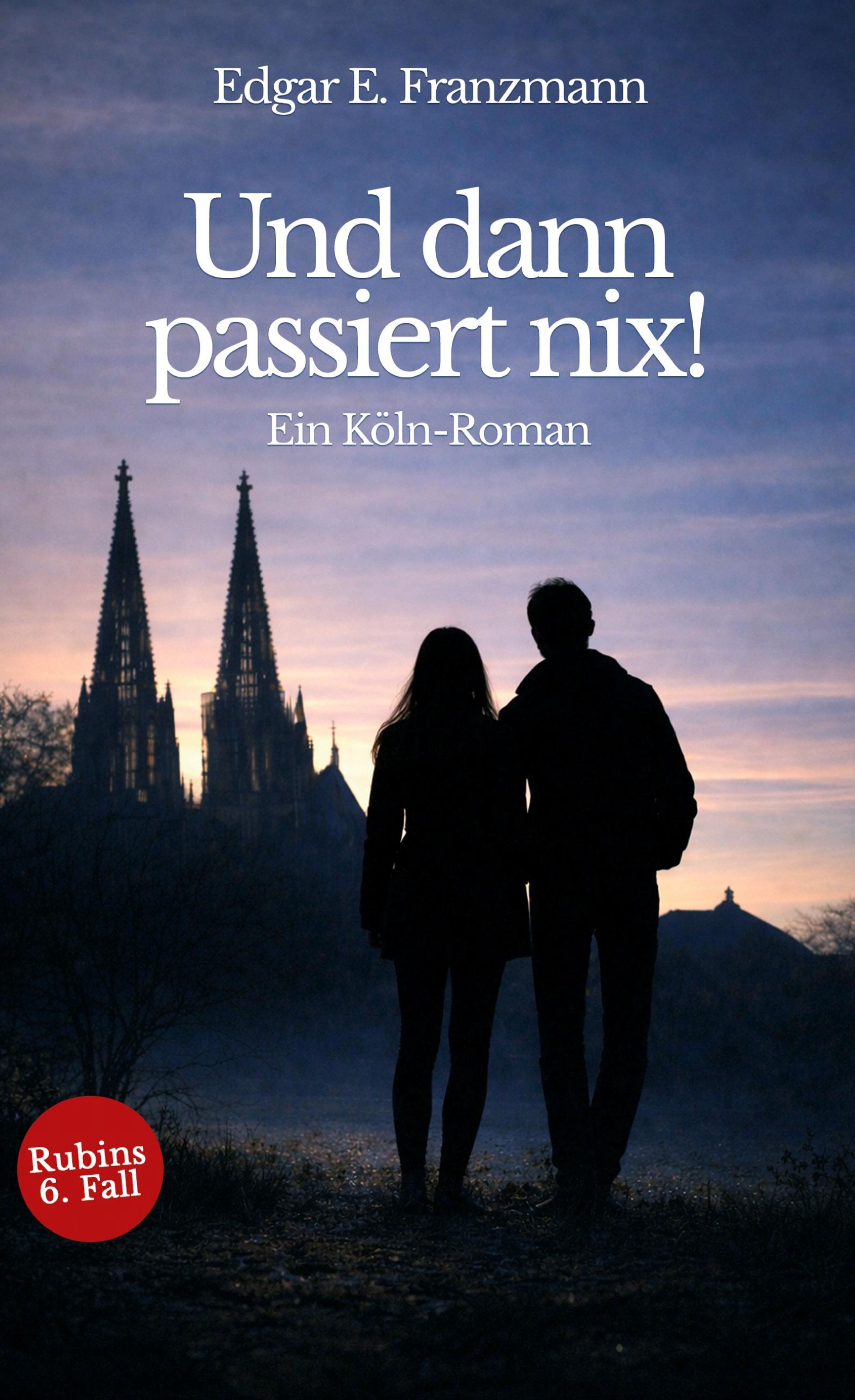 "Edgar E. Franzmann. Und dann passiert nix! Ein Köln-Roman. Silhouetten zweier Personen vor Kölner Dom bei Sonnenuntergang.", Buch
