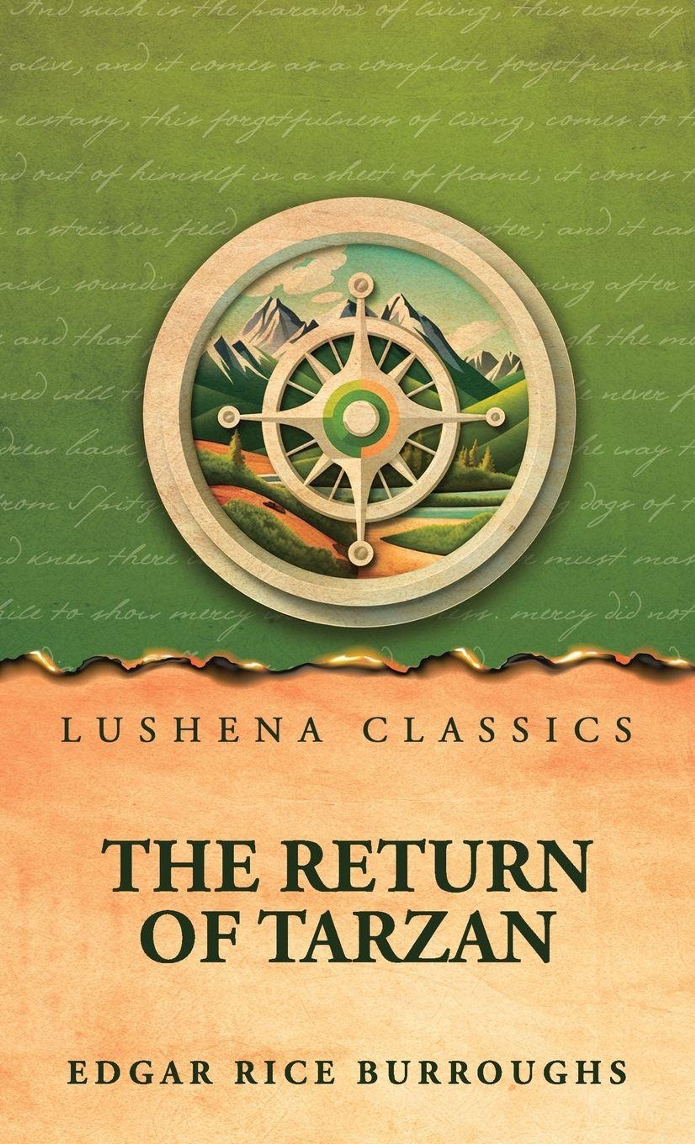 Oben steht „Lushena Classics“. Darunter „The Return of Tarzan“ von Edgar Rice Burroughs. Eine Kompassrose ziert eine grüne Landschaft., Buch