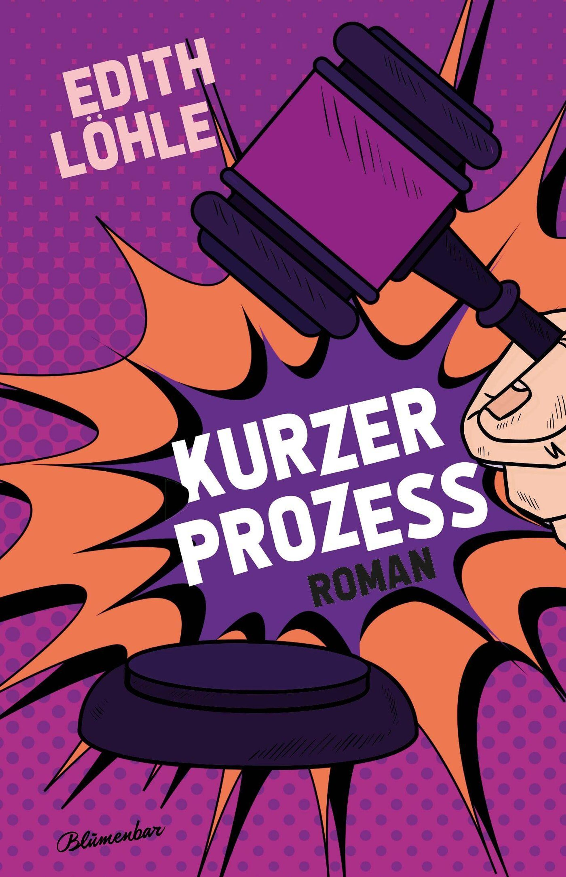 EDITH LÖHLE, KURZER PROZESS, ROMAN. Comic-Stil: Lila Hintergrund, Richterhammer und Plopp-Effekt., Buch