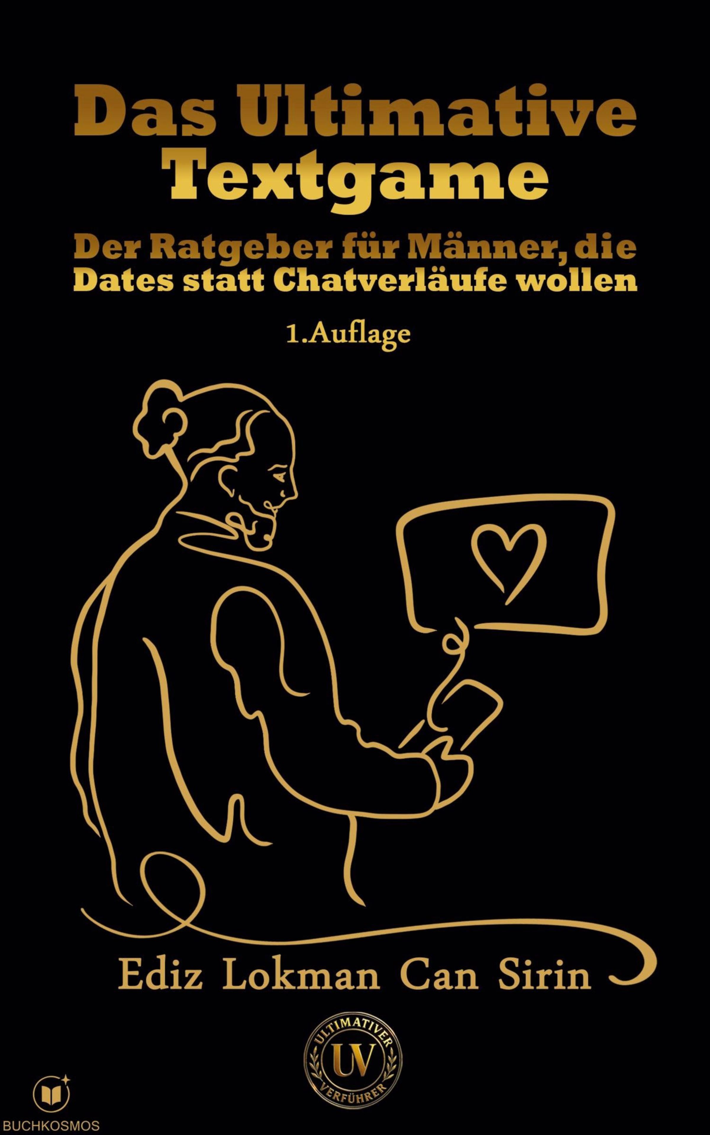„Das Ultimative Textgame“ steht in großen Buchstaben. Ein stilisierter Mann mit Handy, daneben ein Herz auf einem Bildschirm., Buch