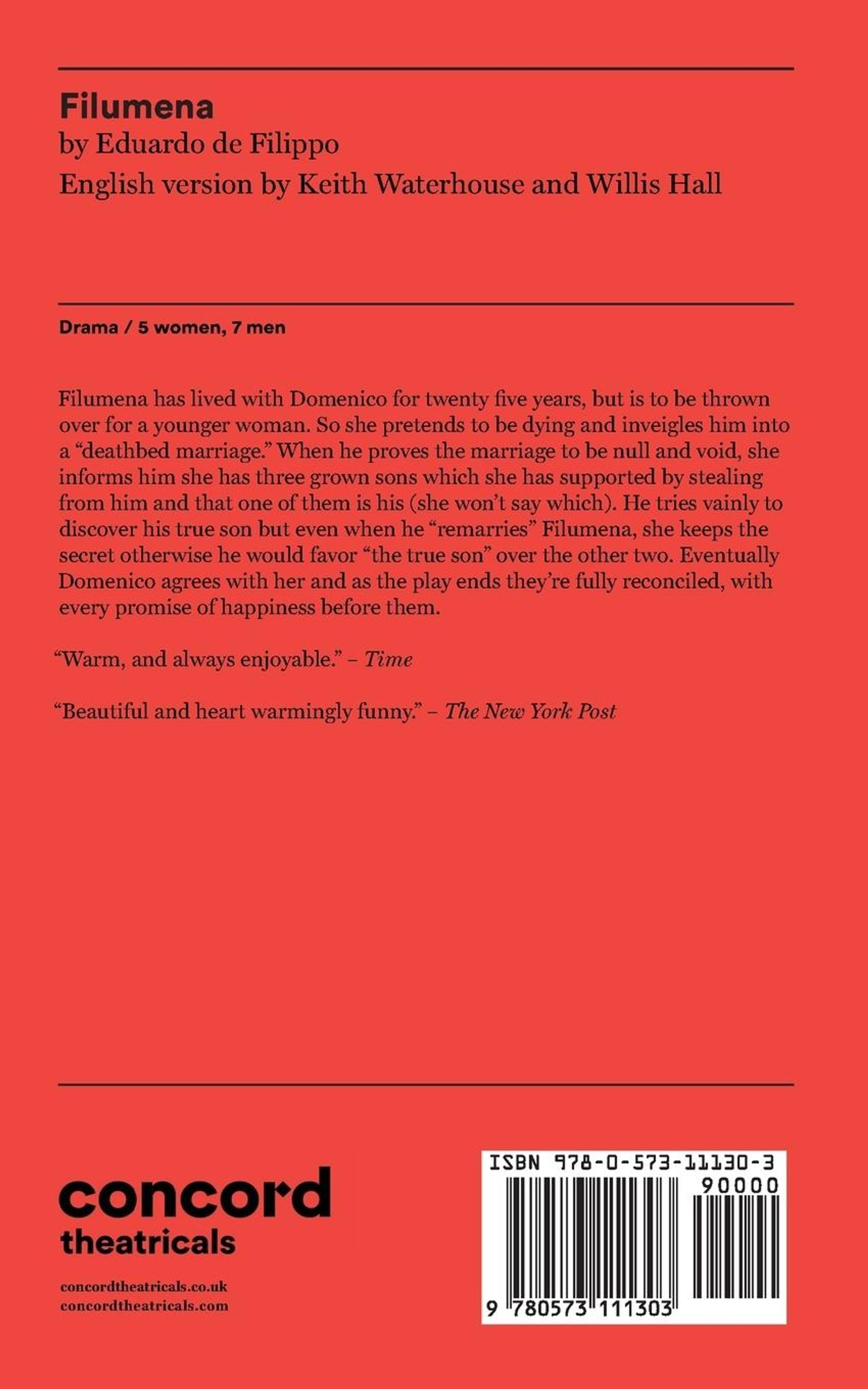 Filumena has lived with Domenico for twenty five years, but is to be thrown over for a younger woman. So she pretends to be dying and inveigles him into a "deathbed marriage." When he proves the marriage to be null and void, she informs him she has three grown sons which she has supported by stealing from him and that one of them is his (she won't say which).5 women, 8 men