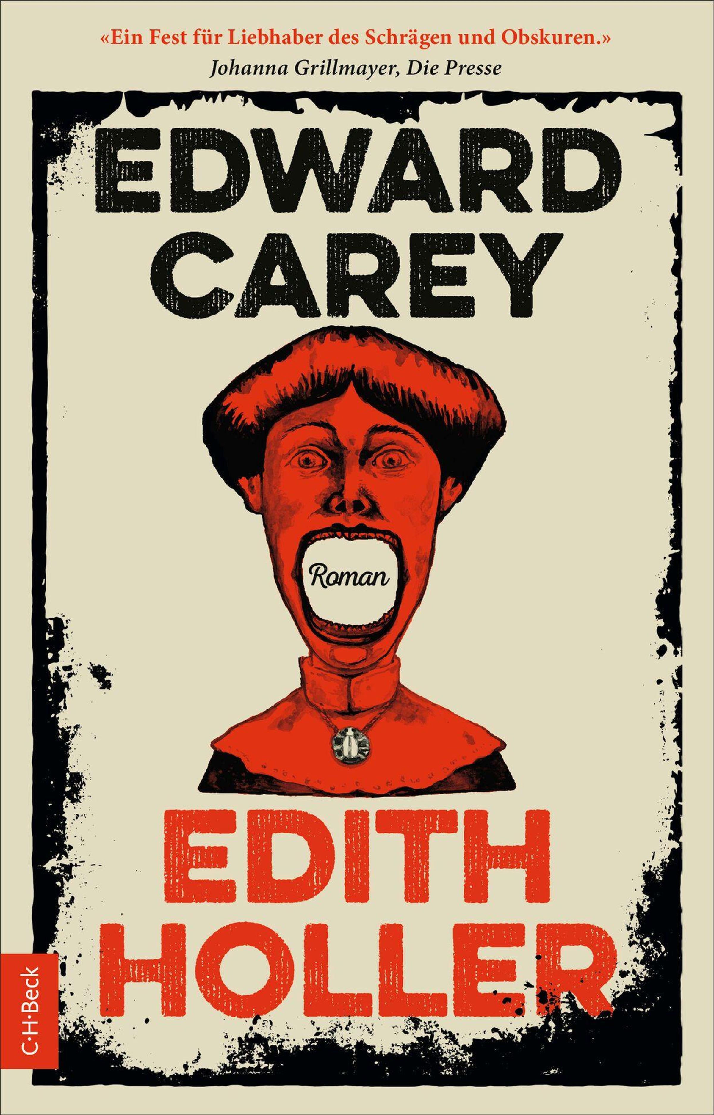 Oben: „Ein Fest für Liebhaber des Schrägen und Obskuren.“ Text: EDWARD CAREY, darunter „Roman“ im offenen Mund, EDITH HOLLER., Buch
