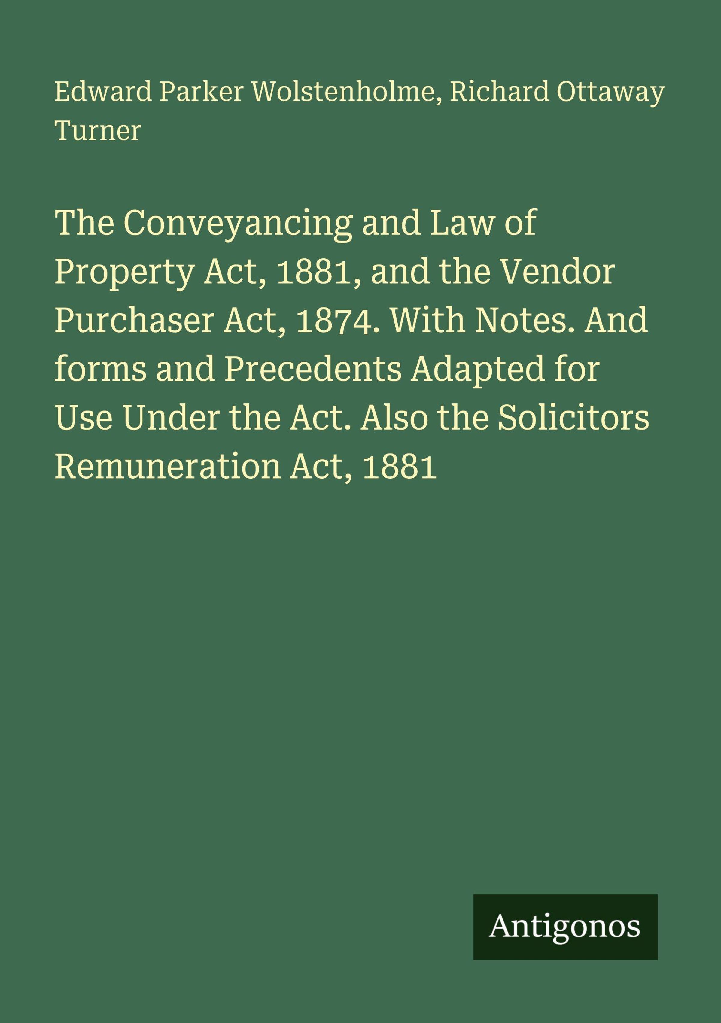 The Conveyancing and Law of Property Act, 1881, and the Vendor Purchaser Act, 1874. With Notes. And forms and Precedents Adapted for Use Under the Act. Also the Solicitors Remuneration Act, 1881