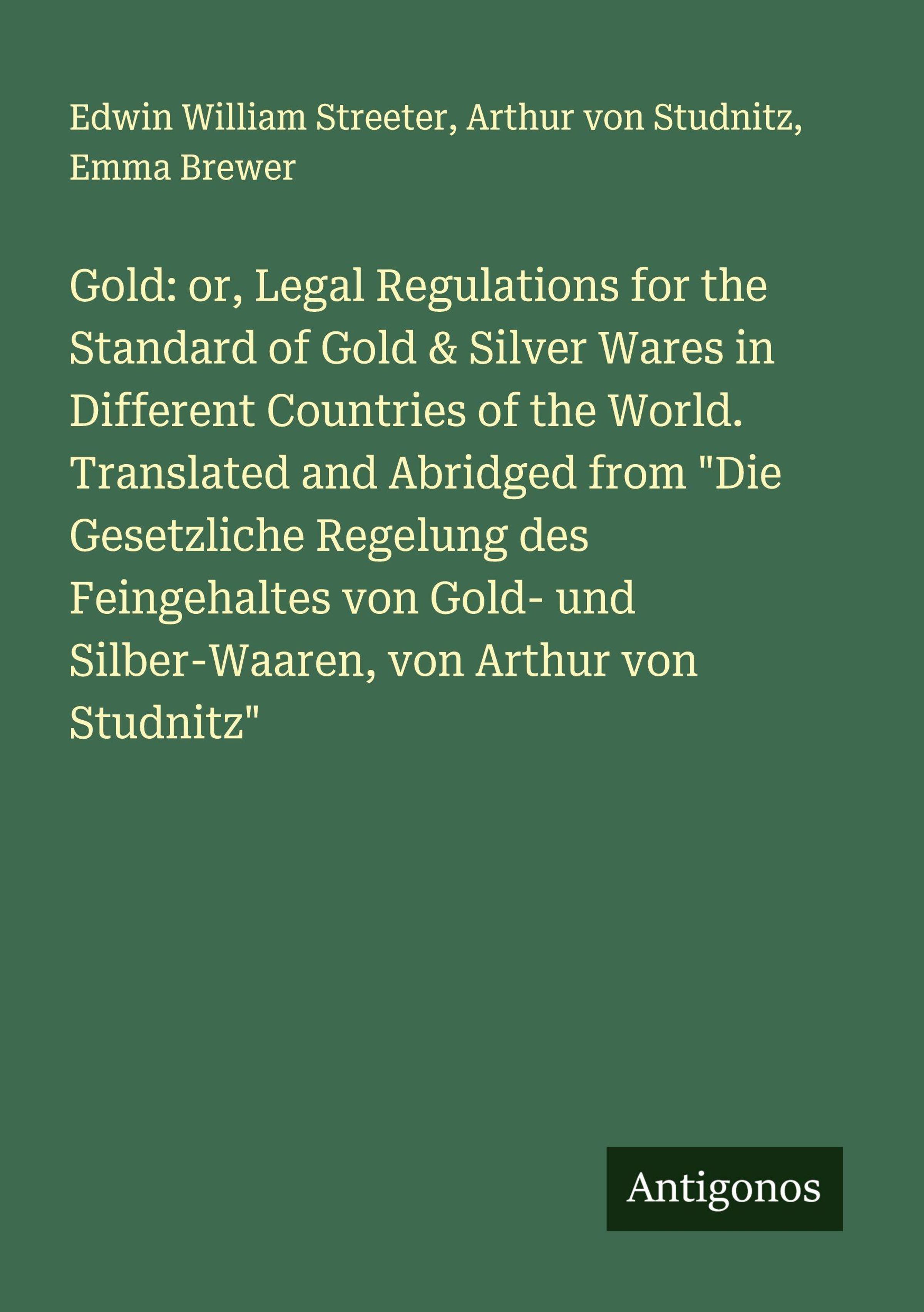 Gold: or, Legal Regulations for the Standard of Gold & Silver Wares in Different Countries of the World. Translated and Abridged from "Die Gesetzliche Regelung des Feingehaltes von Gold- und Silber-Waaren, von Arthur von Studnitz"