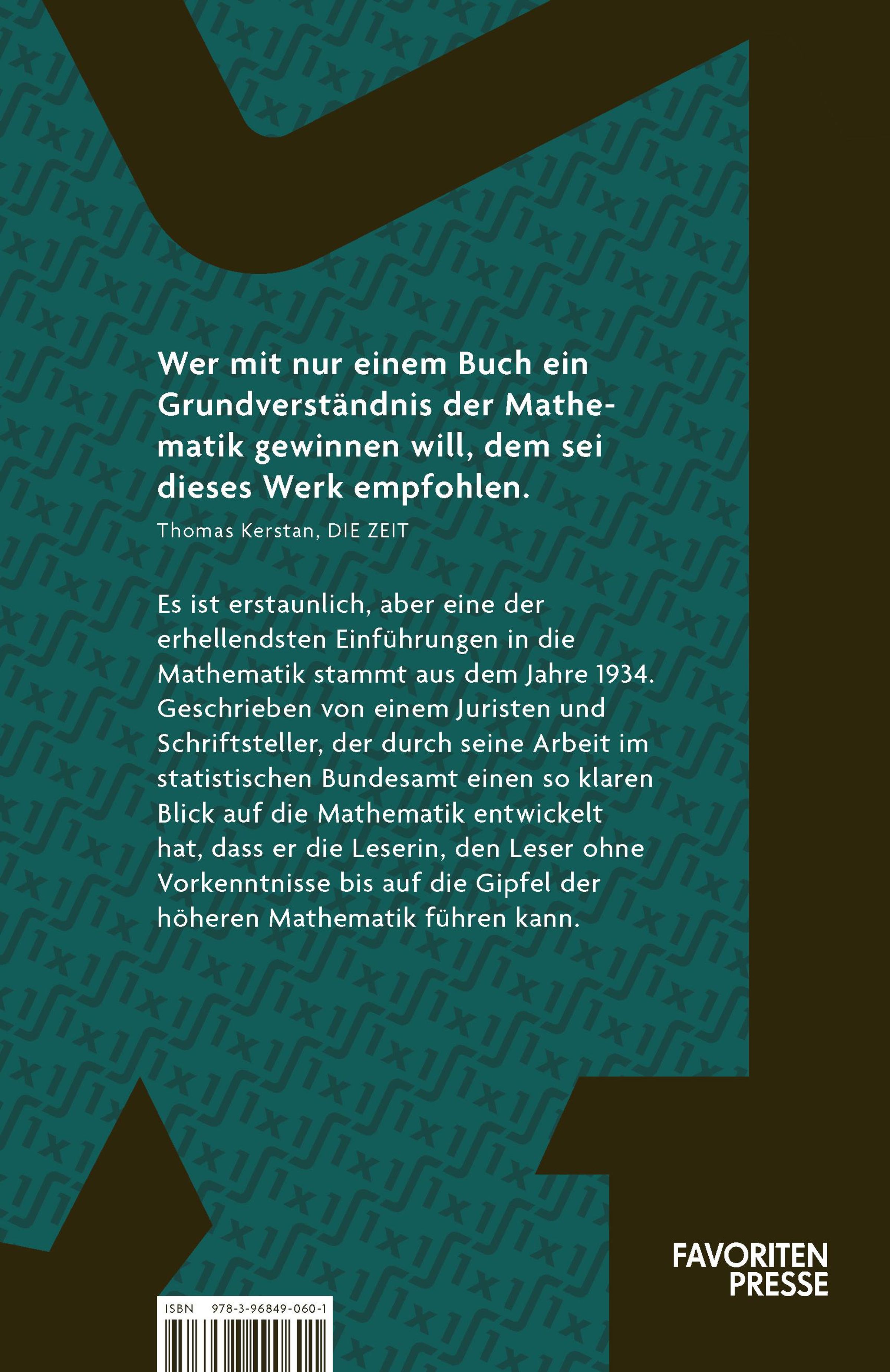 Es ist erstaunlich, aber eine der erhellendsten Einführungen in die Mathematik stammt aus dem Jahre 1934. Geschrieben von einem Juristen und Schriftsteller, der durch seine Arbeit im statistischen Bundesamt einen so klaren Blick auf die Mathematik entwickelt hat, dass er die Leserin, den Leser ohne Vorkenntnisse bis auf die Gipfel der höheren Mathematik führen kann.