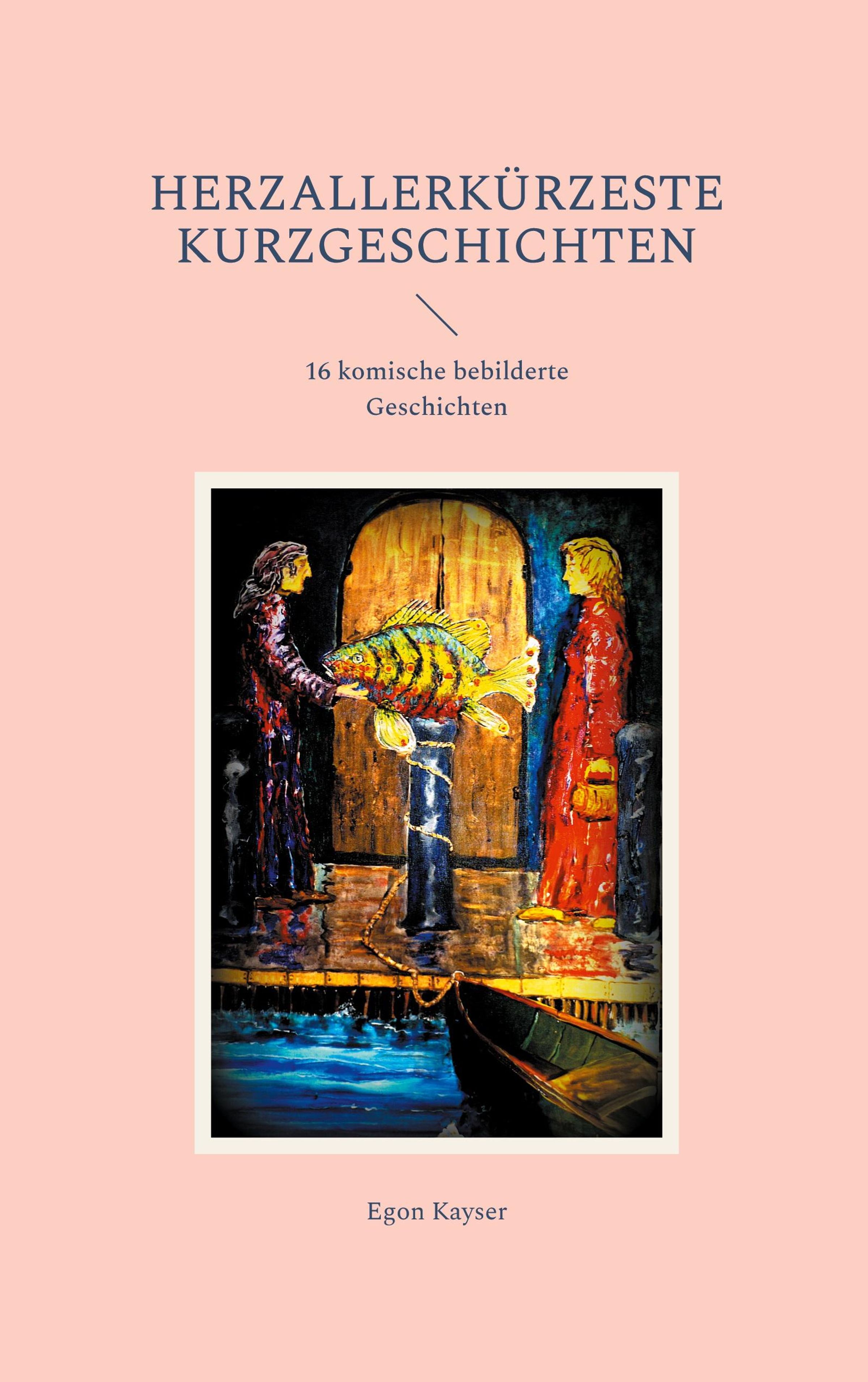 "HERZALLERKÜRZESTE KURZGESCHICHTEN"; Illustration zweier Figuren mit Fisch vor Tür; "16 komische bebilderte Geschichten"., Buch
