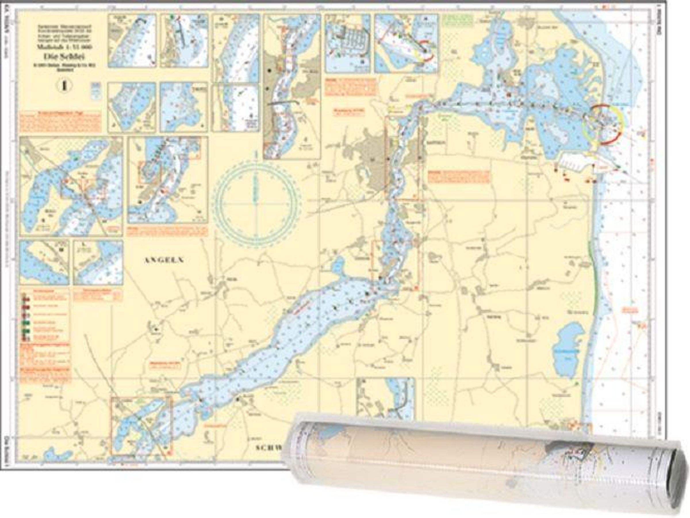 Seekarte, Maßstab 1:50.000, Titel "Die Schlei". Farbige Darstellung eines Gewässers und Umgebung mit Kartenausschnitten., Karten